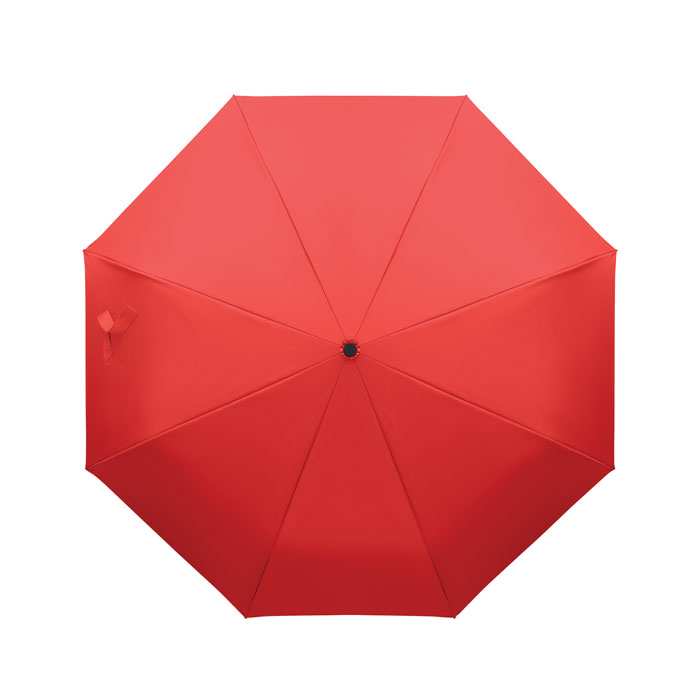 Foldable 21'' windproof umbrella with full black plating fibreglass frame with 2 sections. Fibreglass ribs. 190T RPET pongee panels. D shape carabiner handle w/ rubber finish. Auto open and closure. Includes pouch