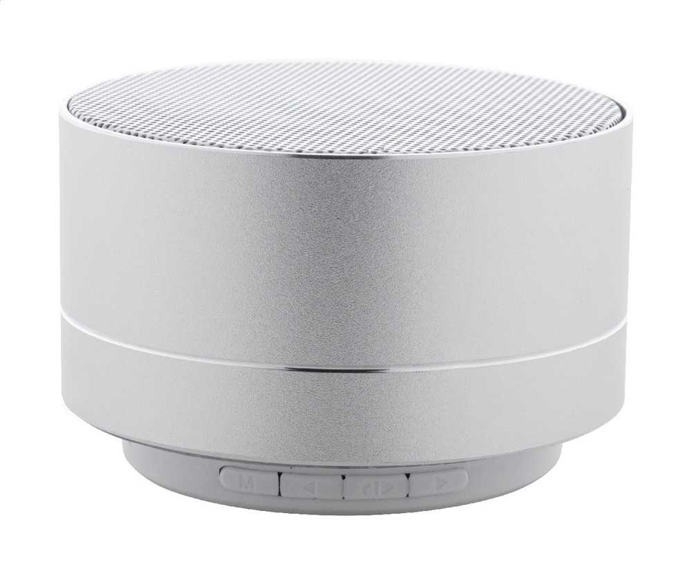 Recycled aluminium wireless speaker with metal mesh, LED light on the bottom and rechargeable battery (300 mAh). With hands-free call and micro SD MP3 playback functions. Including USB charger cable.