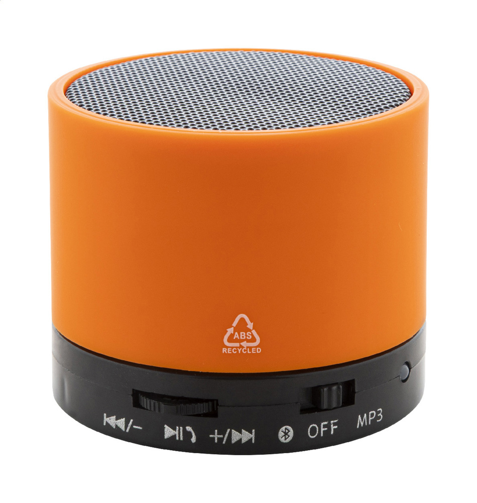 Recycled ABS wireless speaker in rubberized housing with metal mesh and rechargeable battery (300 mAh). With hands-free call and micro SD MP3 playback functions. Including USB charger cable.