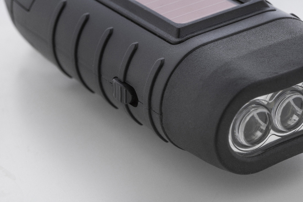 Recycled ABS flashlight with 3 LEDs, built-in solar and dynamo chargers, and carabiner clip.