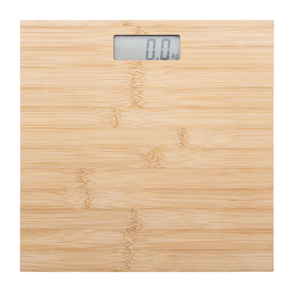 Digital bathroom scale with bamboo weighing platform. Capacity: 150 kg, graduation 0,1 kg, measurement units: kg/lb/st. With built-in rechargeable battery. Including USB charger cable.
