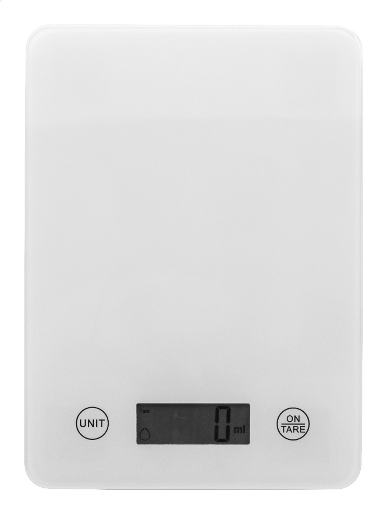 Digital kitchen scale with tempered glass weighing platform and built-in USB rechargeable battery (200 mAh). Capacity: 5 kg, graduation 1 g, measurement units: g/oz. With water/milk ml indicator. Including USB charger cable.