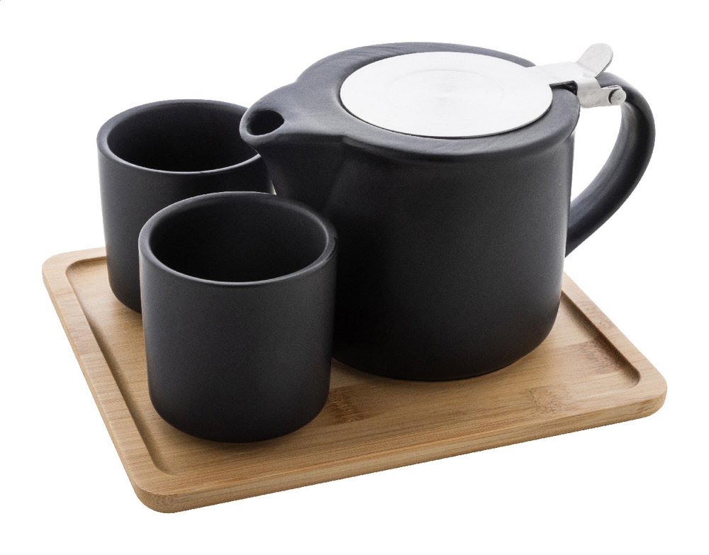 High quality ceramic tea set with matte finish and bamboo serving tray. Including a teapot (500 ml) with stainless steel lid and tea strainer, and two cups (150 ml). In kraft paper box.