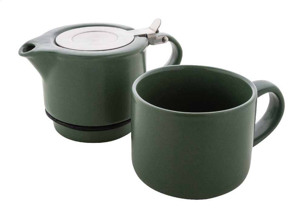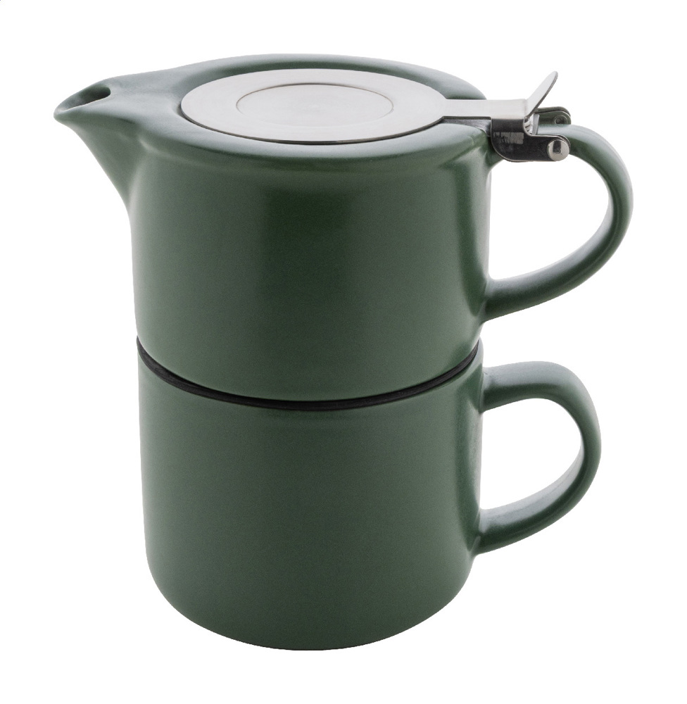 High quality ceramic tea set with matte finish. Including a teapot (430 ml) with stainless steel lid and tea strainer, designed to stack neatly on top of the matching mug (400 ml). In kraft paper box.