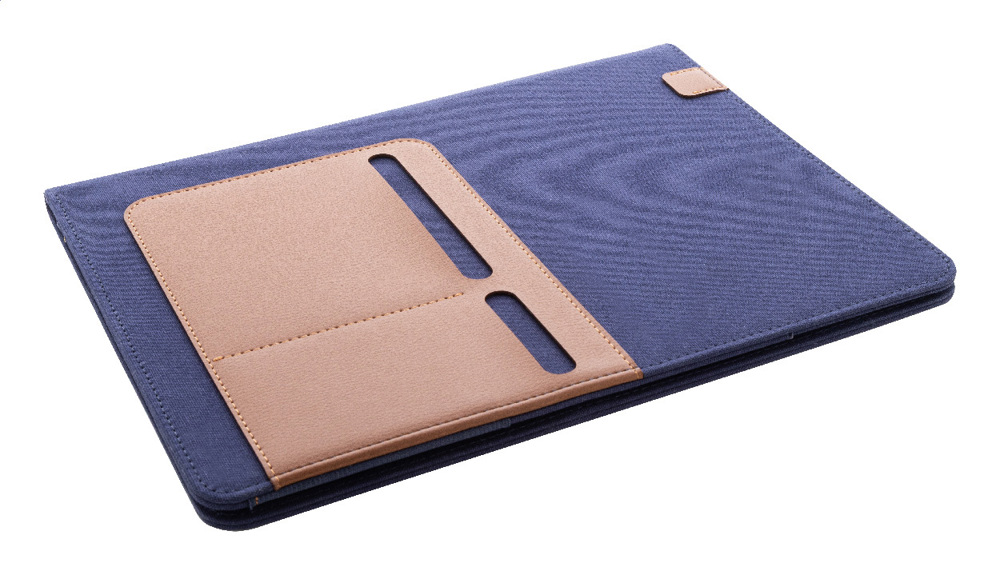 A4 sized, recycled canvas and recycled PU leather document folder with multiple front and inside organizer pockets. With 20 lined sheets notepad in recycled paper. 70% recycled cotton and 30% RPET polyester.