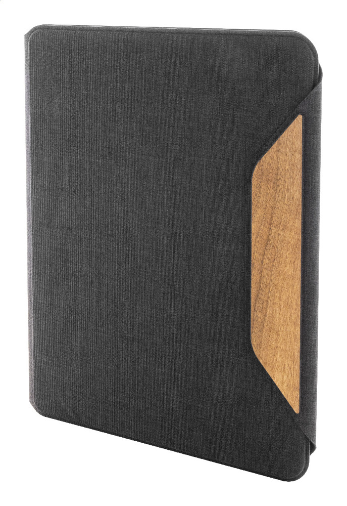 A4 sized, RPET polyester document folder with multiple inside organizer pockets and magnetic closure with walnut wood detail. With 20 lined sheets notepad in recycled paper.