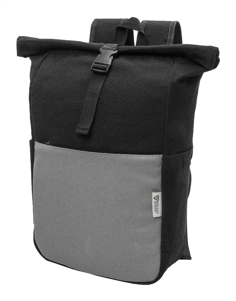 Recycled canvas rolltop backpack with buckle closure and zipped front pocket in soft recycled PU leather. With padded laptop (15") compartment, side pockets, padded back and shoulder straps. 70% recycled cotton and 30% RPET polyester. With distinctive recycled cotton label.