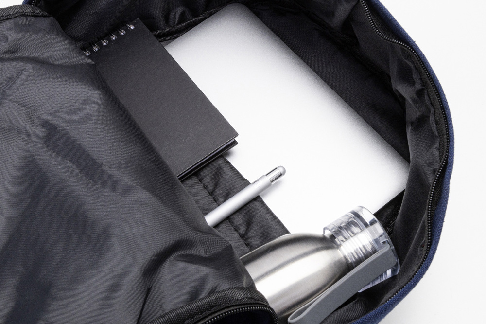 Recycled canvas backpack with zipped main compartment, padded laptop (15") compartment, 2 zipped front pocket, side pockets, trolley strap, padded back and shoulder straps. 70% recycled cotton and 30% RPET polyester. With distinctive recycled cotton label.