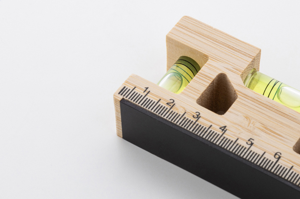 Multifunctional, bamboo keyring with metal ring, ruler, magnet and dual spirit levels. more