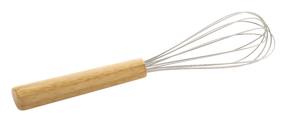 Stainless steel egg whisk with bamboo handle.