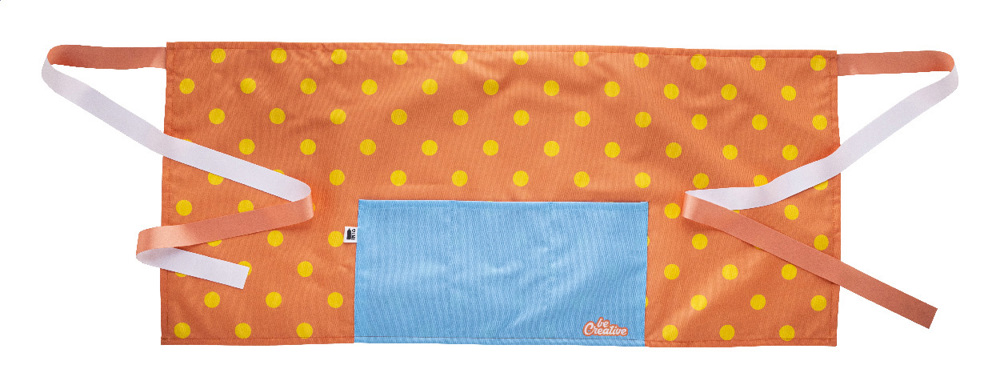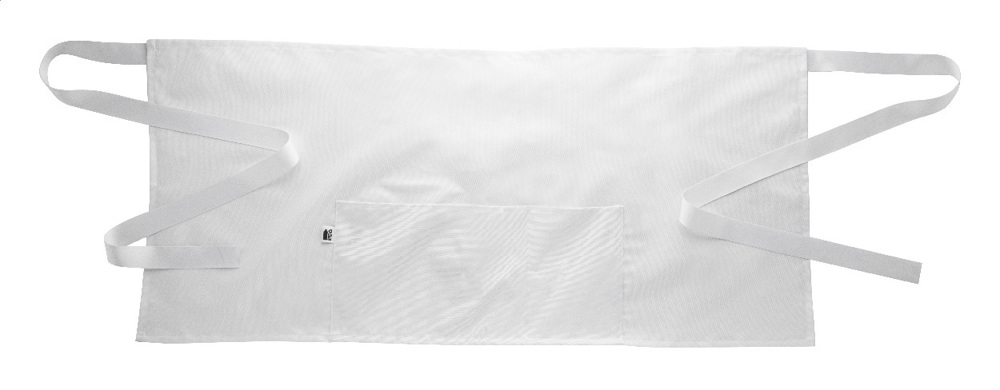 Custom made, 600D RPET polyester bistro apron with triple front pocket and all over sublimation printed graphics and distinctive RPET label. MOQ: 25 pcs.