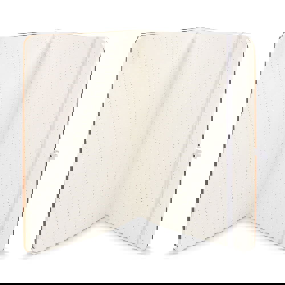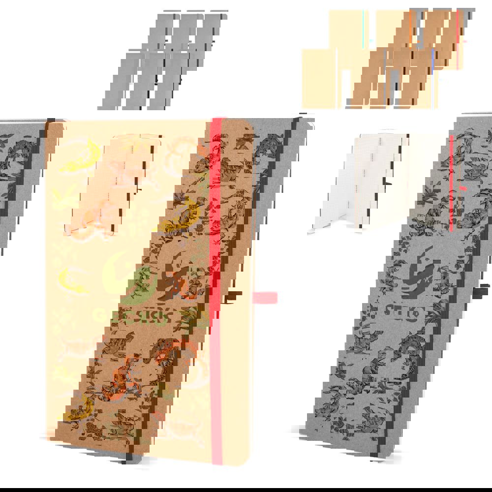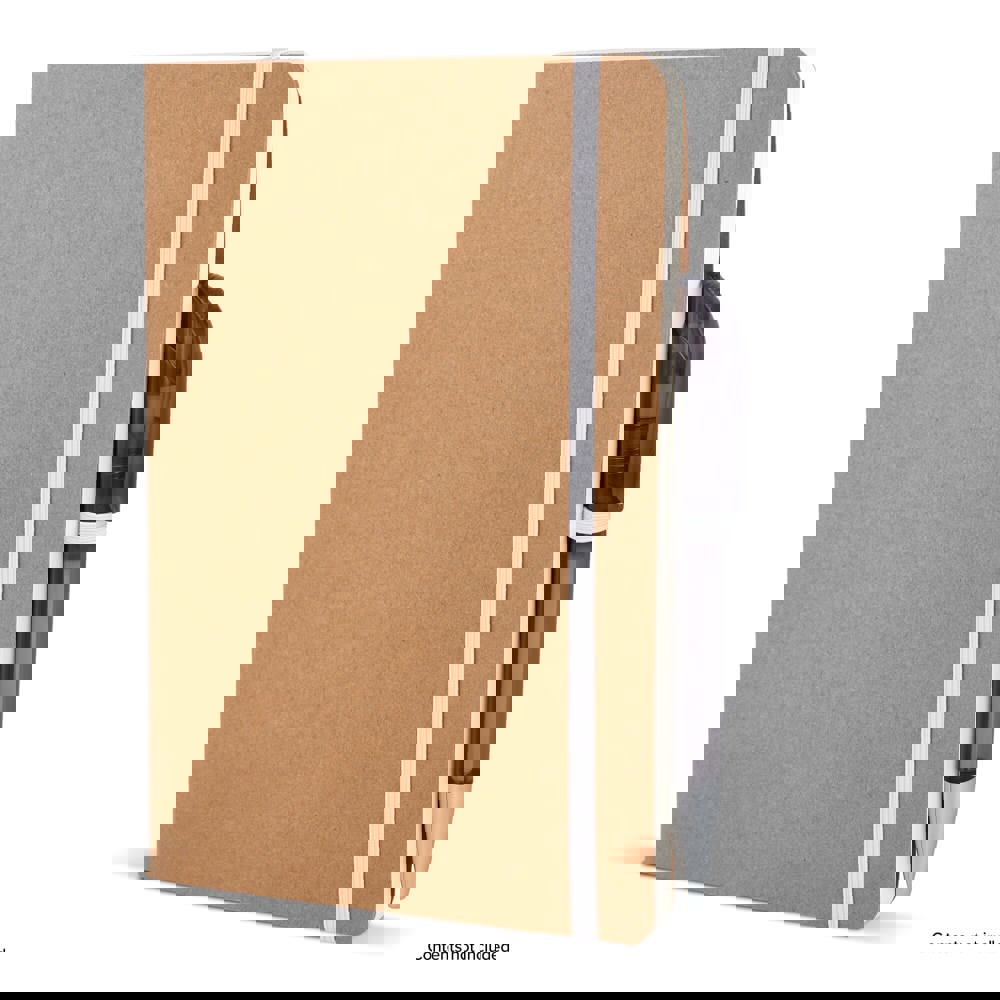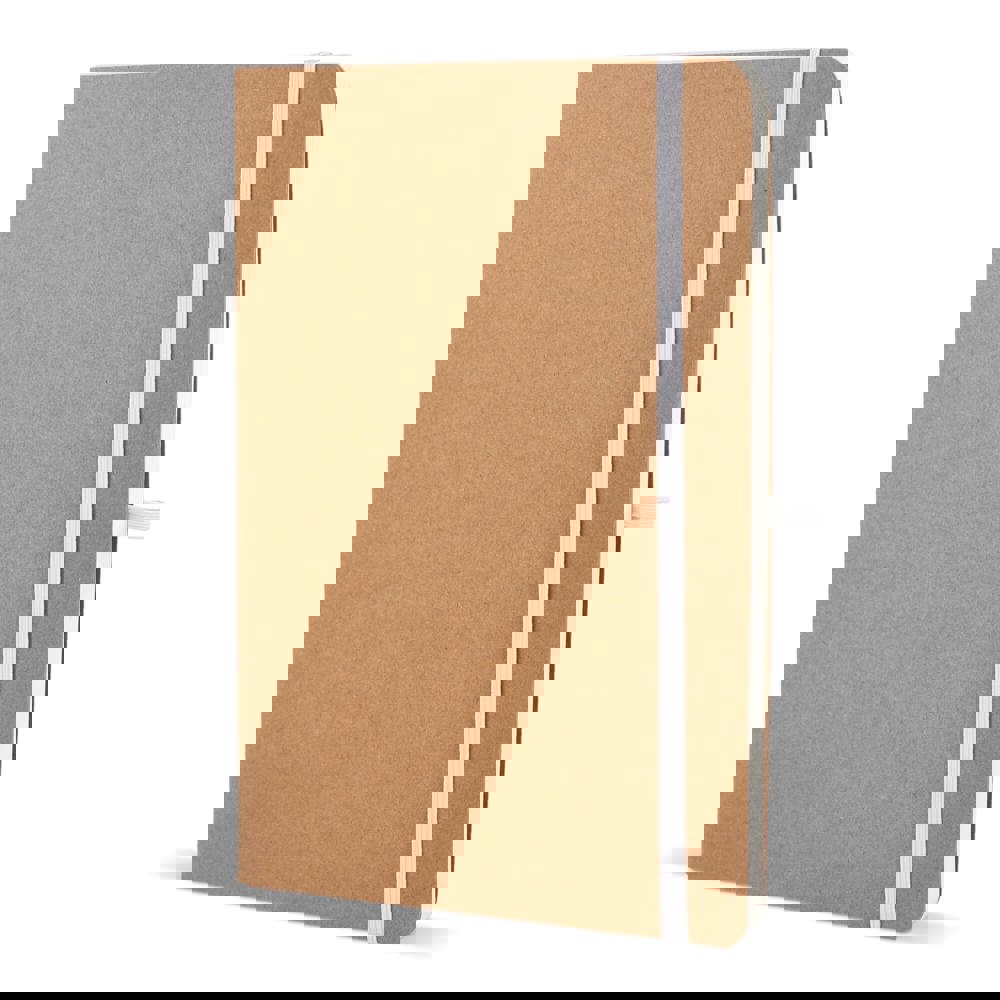A5 notebook with soft kraft paper cover, rounded corners, coloured elastic closure and pen loop. It has 60 lined cream pages made from FSC-certified paper. A practical and natural-looking option for daily notes.