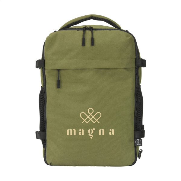 This compact and versatile Cabin Flight backpack is designed to be carried on board as hand luggage on all airlines. It fits easily under the seat of any aeroplane. With a capacity of approx. 20 litres, the rucksack offers a surprising amount of storage space, while its light weight makes it comfortable to carry. The exterior is made from sturdy recycled RPET 900D polyester. Fully lined with recycled RPET 210D polyester. The spacious main compartment, with zip and double zip pullers, is ideal for clothing and features a handy organiser for your phone, personal documents and other essentials. An extra padded laptop compartment provides safe protection for laptops up to 15.6 inches. The bag has elastic mesh pockets on both sides, ideal for a water bottle or small accessories. There is an additional zipped pocket in the back panel. The shoulder straps are attached to the top of this zipped pocket and clipped to the bottom with a carabiner hook. By unhooking the hooks, the straps can be stored completely in the zipped pocket, making the bag even more compact. The adjustable, padded shoulder straps, padded back panel and sturdy handle with mesh lining ensure optimal carrying comfort, even on longer journeys. Includes removable shoulder strap. An integrated trolley strap makes it easy to attach the rucksack to a suitcase. This rucksack is the perfect travel companion for any flight. GRS-certified. Total recycled material: 50%.