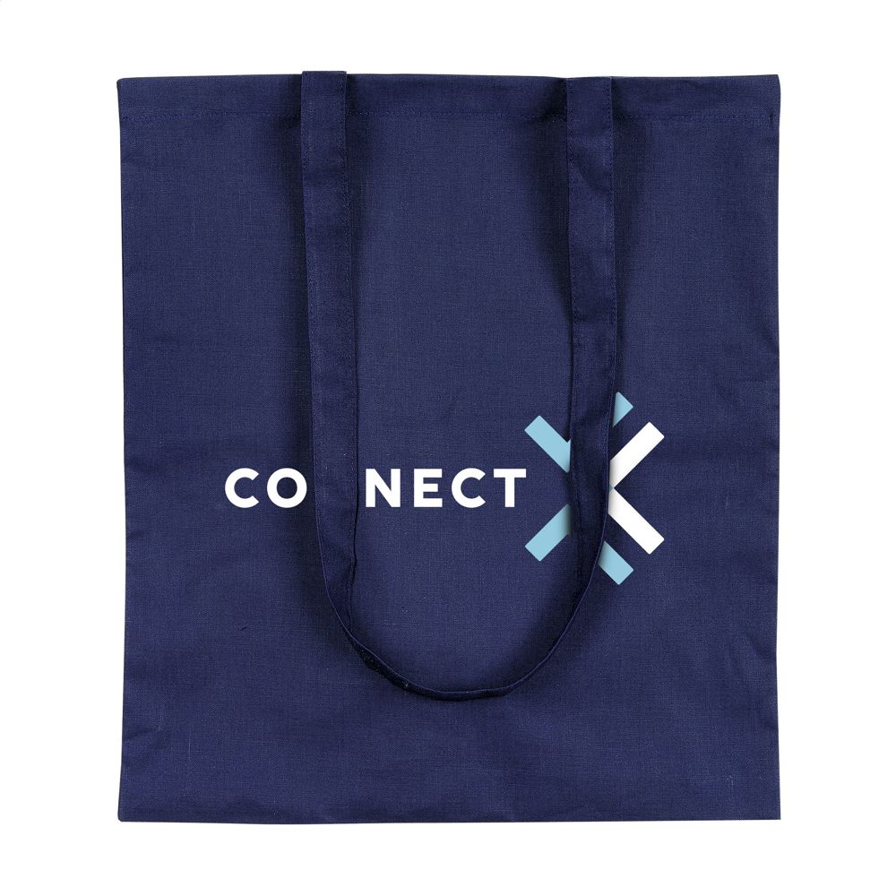 Quality shopping bag with long handles, made from 100% woven cotton (120 g/m²). Capacity approx. 8 litres.