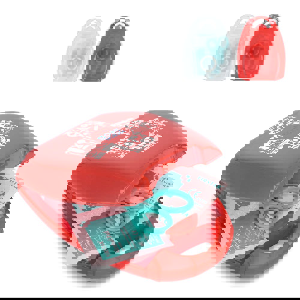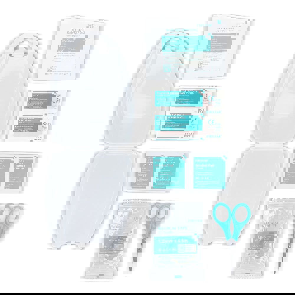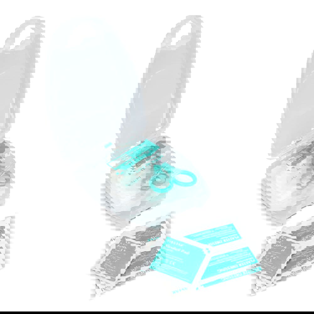 This compact first aid kit comes in a sturdy PP case and complies with European standards. Perfect for travel, offices, cars, or giveaways. It provides essential items for small injuries and quick care. Contents: 2 × alcohol pads, 5 × adhesive plasters 72 × 19 mm, 1 × scissors, 1 × medical tape 1.25 cm × 4.5 m, 1 × non-woven sponges 2" × 2" 4-ply (5pcs/pack).
