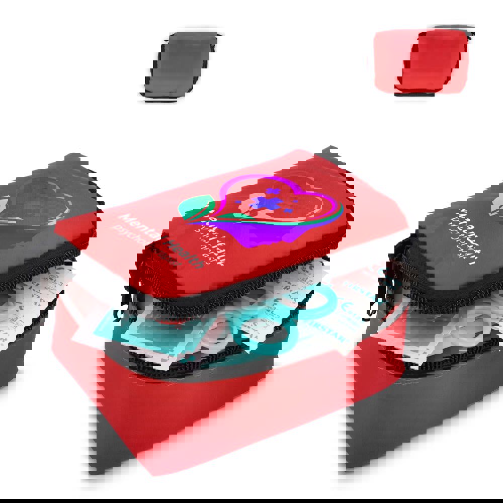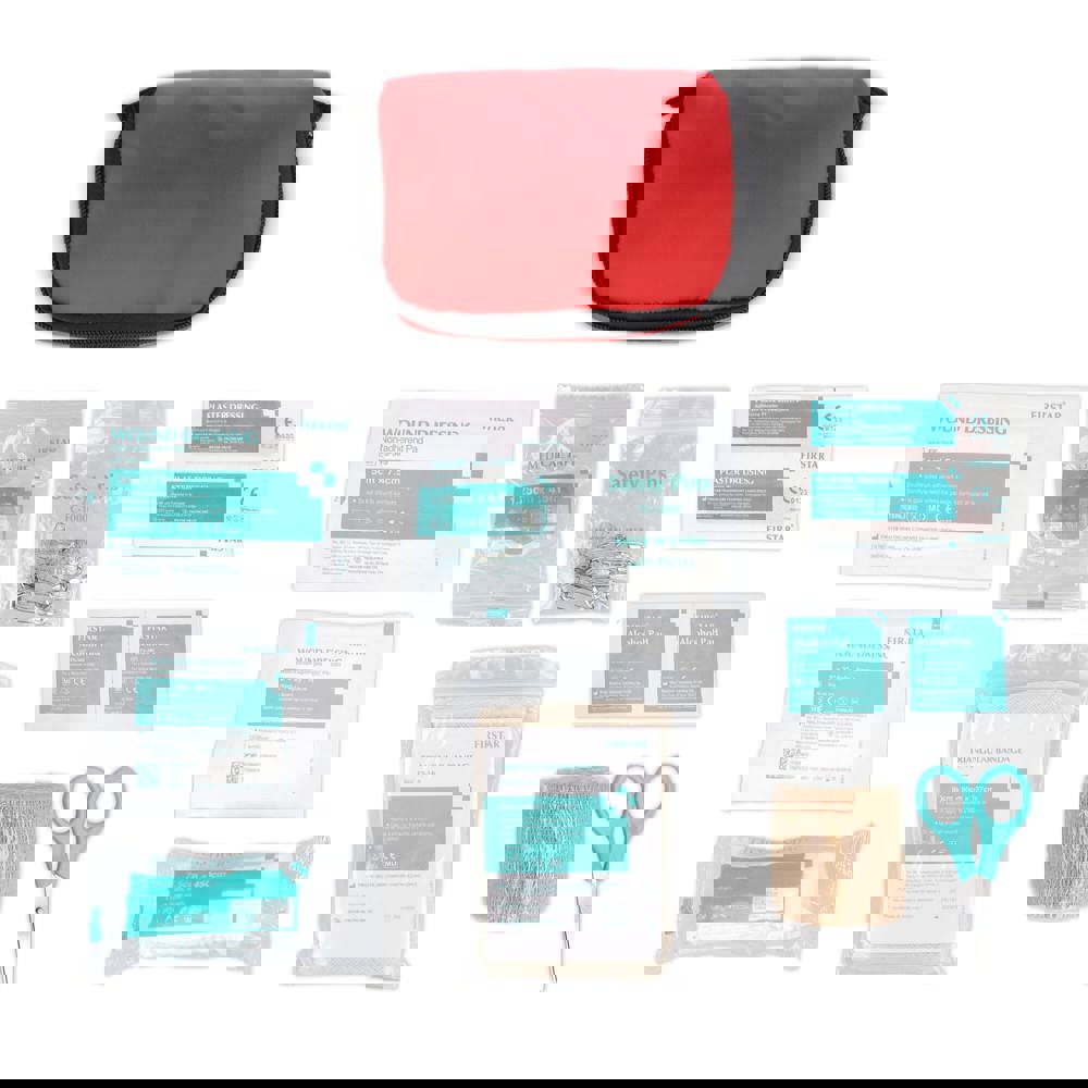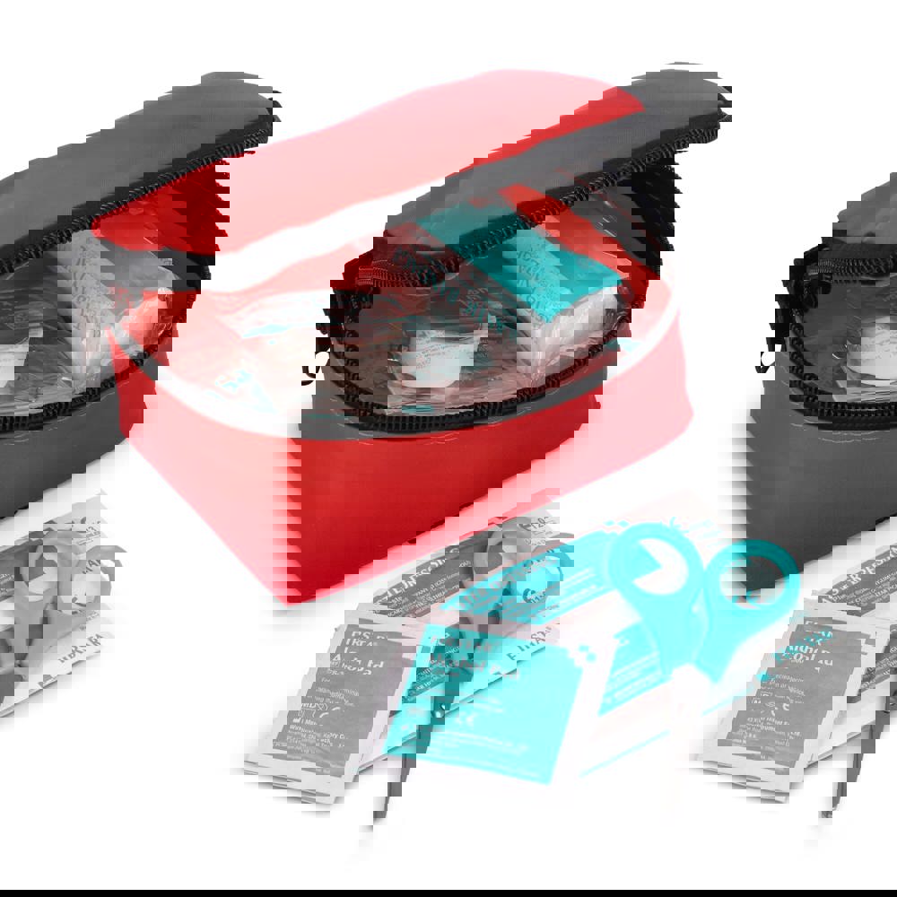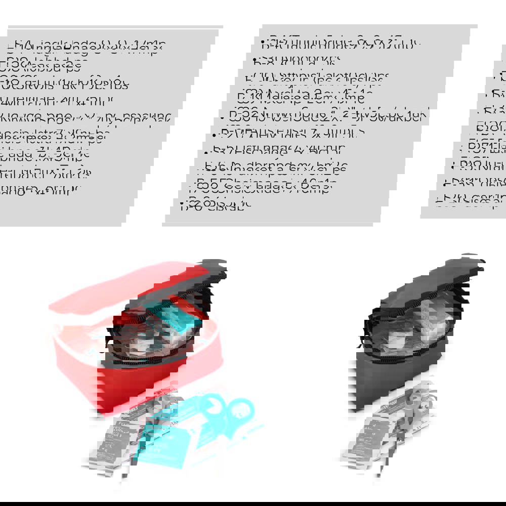 This first aid kit comes in a nylon bag with Velcro straps underneath, allowing it to be attached to a bicycle handle or carried on the wrist. Compliant with European standards, it is ideal for cycling, hiking, or other outdoor activities. Compact and practical, it contains essentials for treating minor injuries and sprains. Contents: 1 × triangular bandage 90 × 90 × 127 cm, 2 × alcohol pads, 1 × pack of 10 safety pins, 1 × medical tape 1.25 cm × 4.5 m, 1 × pack of 5 non-woven sponges 2" × 2" 4-ply, 5 × adhesive plasters 72 × 19 mm, 1 × elastic bandage 7.5 × 450 cm, 2 × non-adherent pads 5 × 7.5 cm, 1 × cohesive bandage 5 × 450 cm, 1 × scissors.