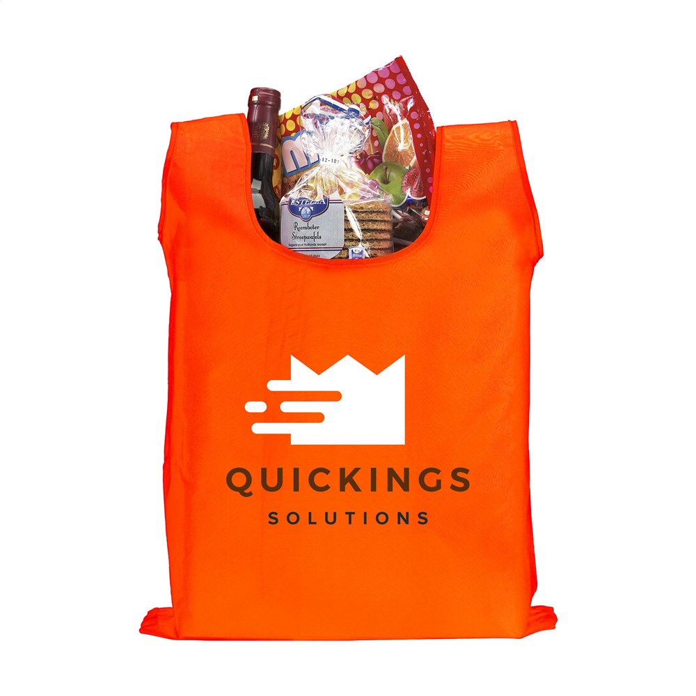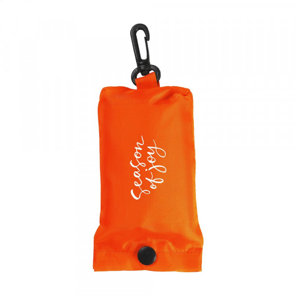 Foldable shopping bag made from 190T polyester. With pouch with a press stud and carabiner. The bag is delivered unfolded with a separate pouch. Meas. folded 6 x 2,5 x 12,5 cm. Capacity approx. 8 litres.