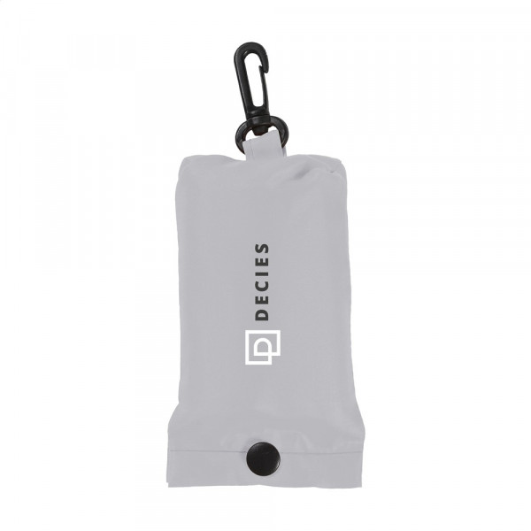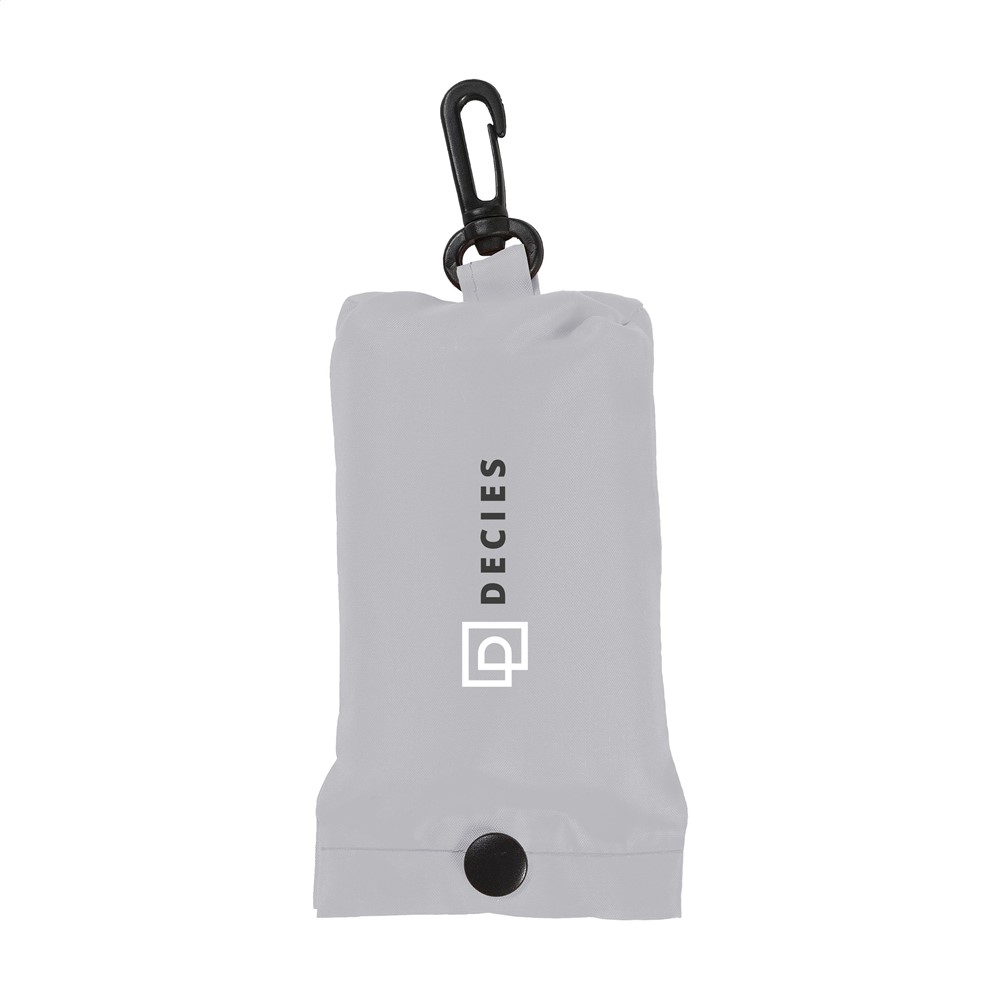 Foldable shopping bag made from 190T polyester. With pouch with a press stud and carabiner. The bag is delivered unfolded with a separate pouch. Meas. folded 6 x 2,5 x 12,5 cm. Capacity approx. 8 litres.
