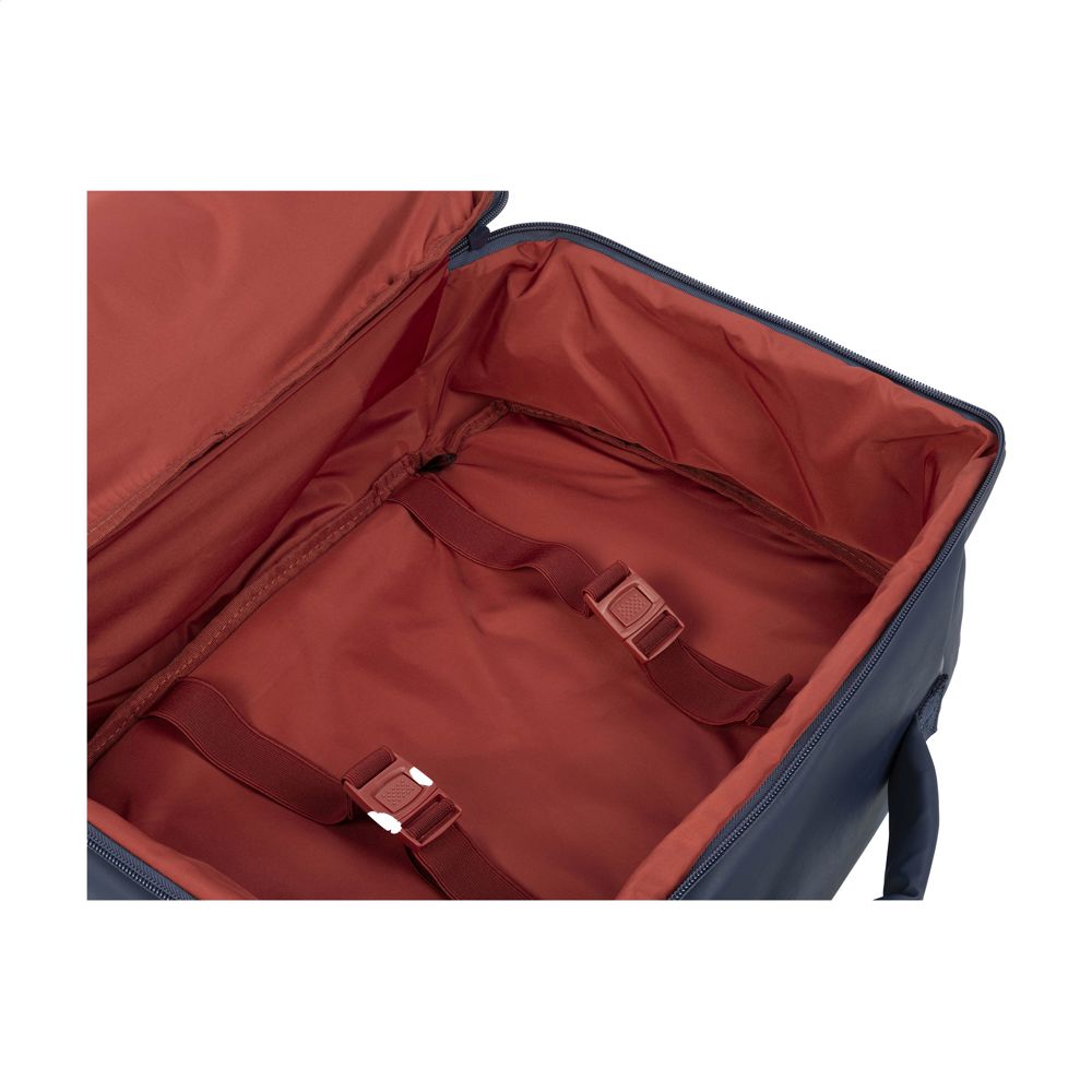 Carry-on travel cabin-backpack from the Italian brand Tucano. This backpack meets the size requirements of all low-cost airlines. Made from rain-resistant, resin-coated material produced from recycled plastic, including 23 recycled PET bottles. The zips are also rain-resistant. This travel-friendly cabin backpack has a spacious interior compartment for clothing and accessories, a large zipped pocket on the front and a side pocket for an umbrella or water bottle. It has a padded compartment on the back for carrying laptops up to 15.6 inch or a MacBook Pro 16 inch. There is a hidden zipped pocket on the back for storing personal documents. The bag is fully lined. Thanks to the padded shoulder straps and two handles, one on the top and one on the side, this bag is always easy to carry. This backpack is designed to meet the cabin dimensions of all airlines. It fits under the seat on the aeroplane, making it the ideal travel companion for air travel. Capacity approx. 23 litres.