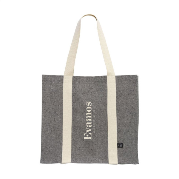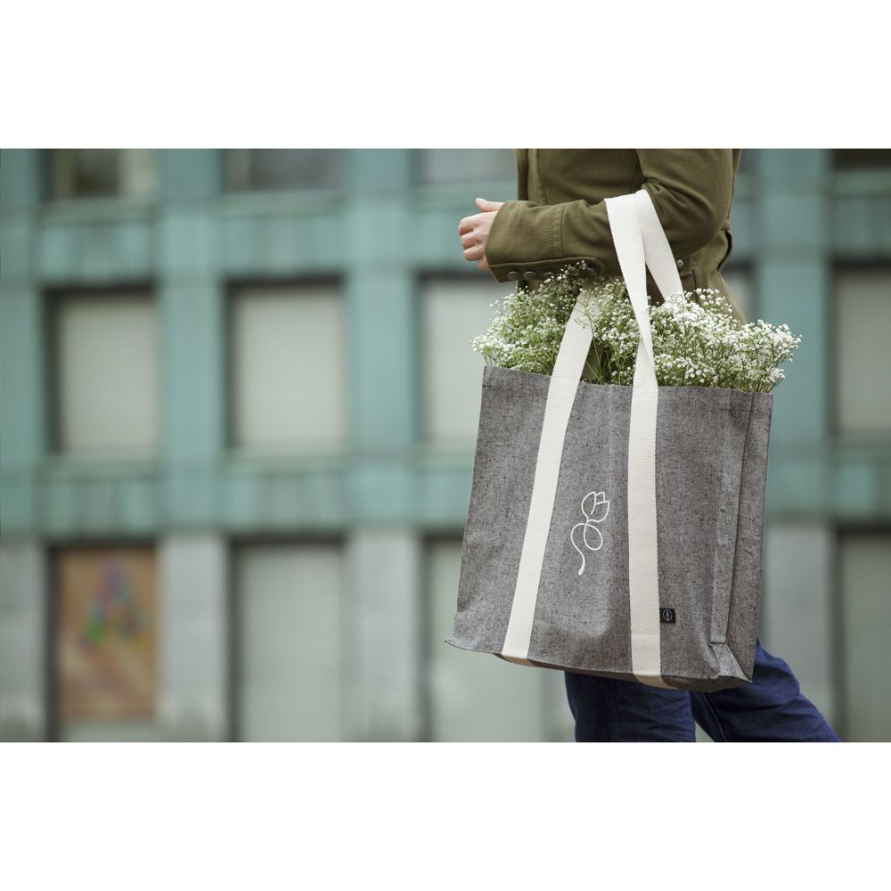 Spacious, sturdy shopping bag made from 80% recycled, melange cotton and 20% recycled, melange polyester (210 g/m²). With a dense, flat weave, long handles and a wide base. The handles feature a striking woven structure and run vertically across the bag as sturdy straps, a beautiful and decorative detail. The bag is suitable for frequent reuse. GRS-certified. Capacity approx. 18 litres.