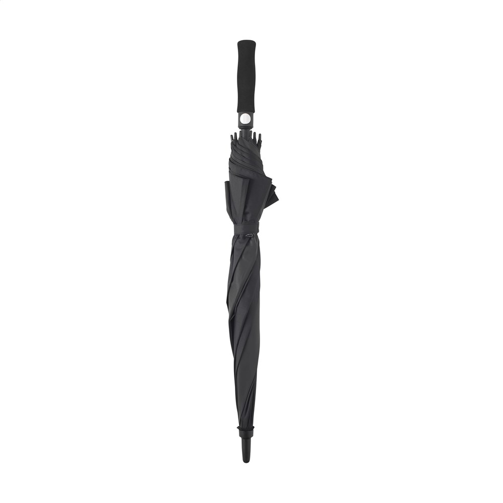 Umbrella with 190T RPETpongee polyester canopy. This umbrella has two discreet, reflective sections which blend into the umbrella’s design in daylight. These reflective sections light up when they catch the light to make the user visible in dark conditions. Features automatic telescopic suspension (auto-open), fibreglass frame, a metal shaft, EVA soft handle and Velcro closure. RCS-certified. Total recycled material: 17%.