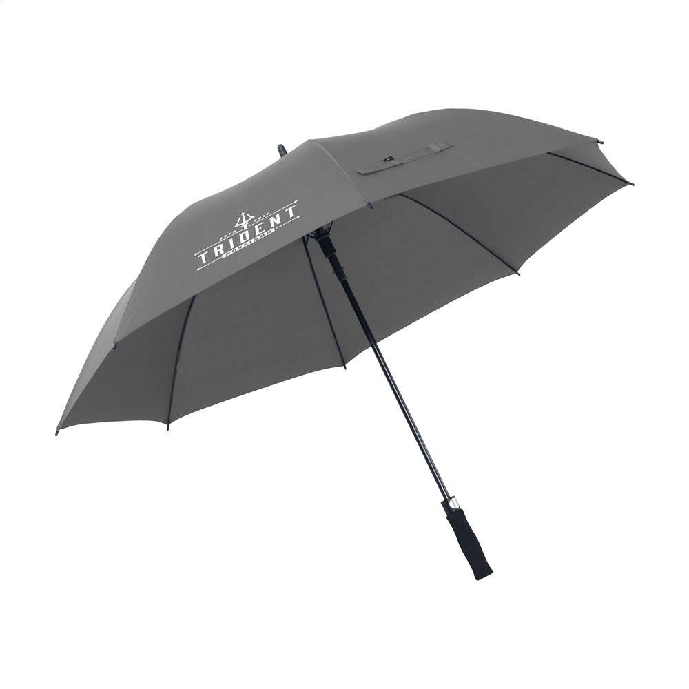 190T RPET pongee umbrella (made from recycled PET bottles) with an extra-large screen diameter of 132 cm. Features include automatic telescopic suspension for ease of opening, fiberglass frame and stem, soft foam handle, velcro closure and water repellent. RCS-certified. Total recycled material: 18%.