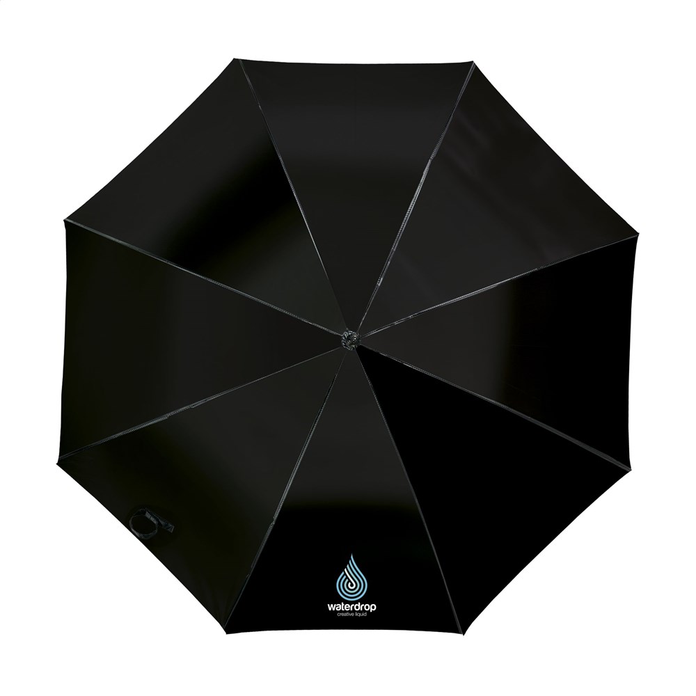 Umbrella with automatic telescopic springs. Features a 190T polyester canopy, fibreglass frame, metal shaft, soft foam handle and Velcro closure.