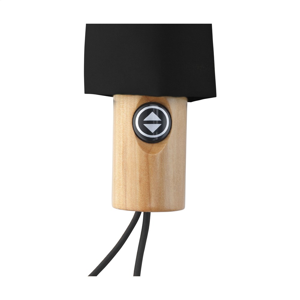 Folding umbrella with automatic opening and closing mechanism. Supplied with an RPET 190T pongee polyester cover. This umbrella also has a stainless-steel shaft and frame wooden handle, elastic carrying loop and Velcro closure. Dim. when folded: Ø 6 x 28,5 cm. RCS-certified. Total recycled material: 16%.