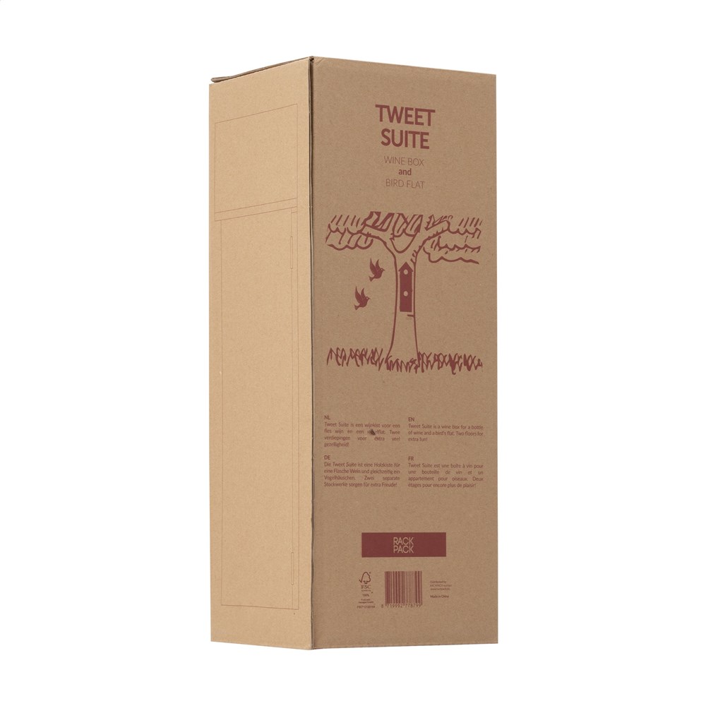 Rackpack Tweet Suite: a wine gift box and bird house in one. The Rackpack Tweet Suite is a wooden gift box for a bottle of wine that turns into a bird house. By hanging this winebox in your backyard, to a tree or on a post you create a nice sustainable bird house to attract all kinds of bird friends. The Tweet Suite brings joy for you and the birds. Rackpack: a wine gift box made from FSC 100% certified wood with a new second life! • suitable for one bottle of wine • 8-10 mm pine wood • wine not included. Packed individually.