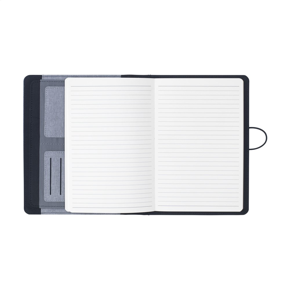 Modern A5 conference/document folder made from RPET material. Equipped with various insert pockets, including a separate compartment for storing a mobile phone, two compartments for cards and a loop for attaching a pen. Includes notebook with approx. 64 sheets of FSC certified, cream-coloured lined paper (70 g/m²).