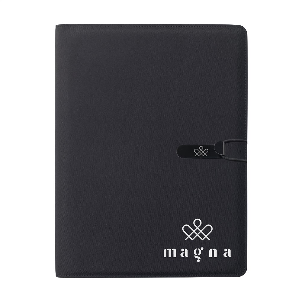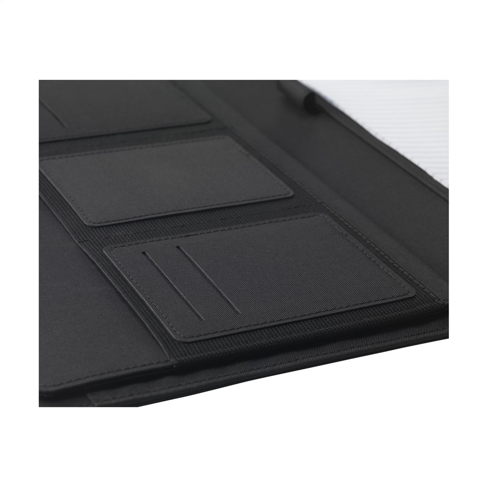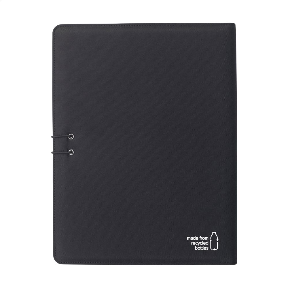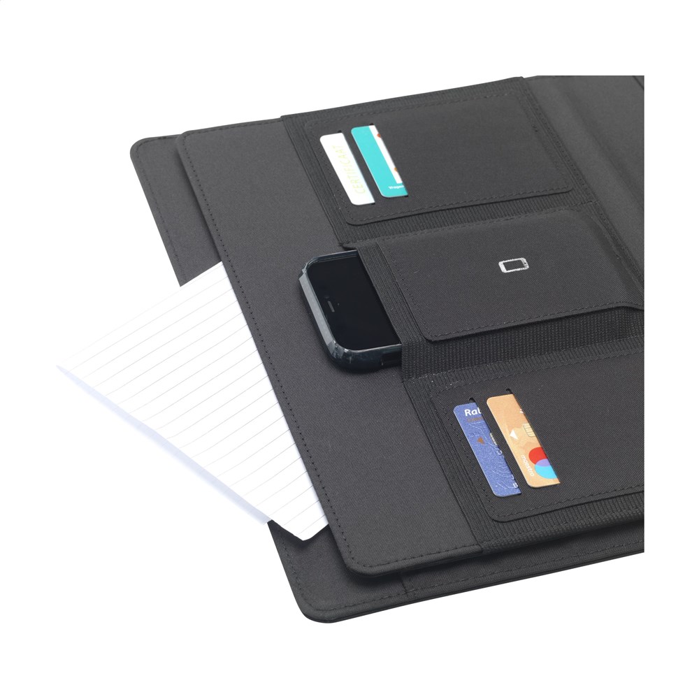 Modern A4 conference/document made from RPET material. Supplied with a number of handy pockets as well as a separate compartment for storing a mobile phone. A pen loop is also included. The folder includes a writing pad with 20 sheets of FSC certified, white lined paper (70 g/m²). RCS-certified. Total recycled material: 6%.