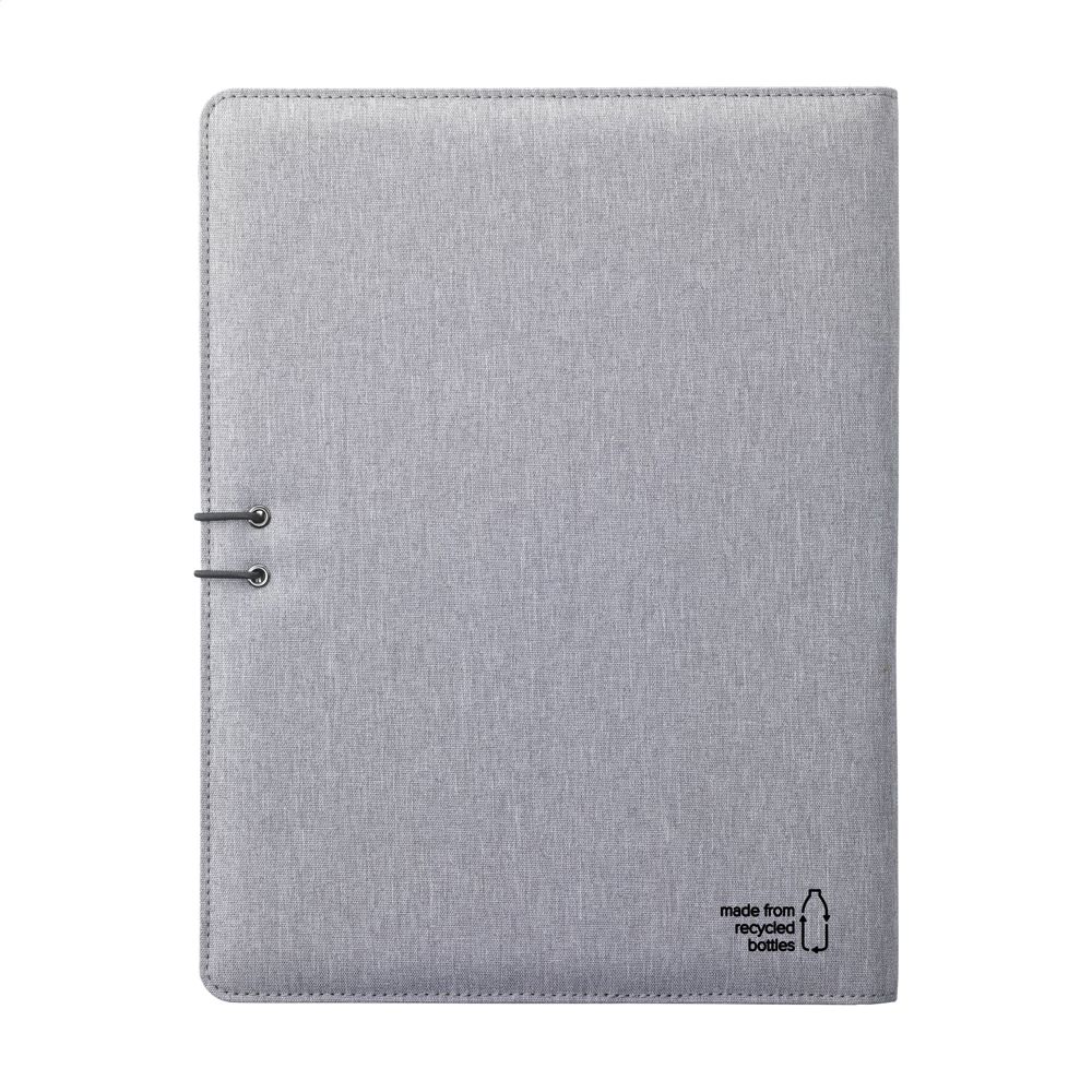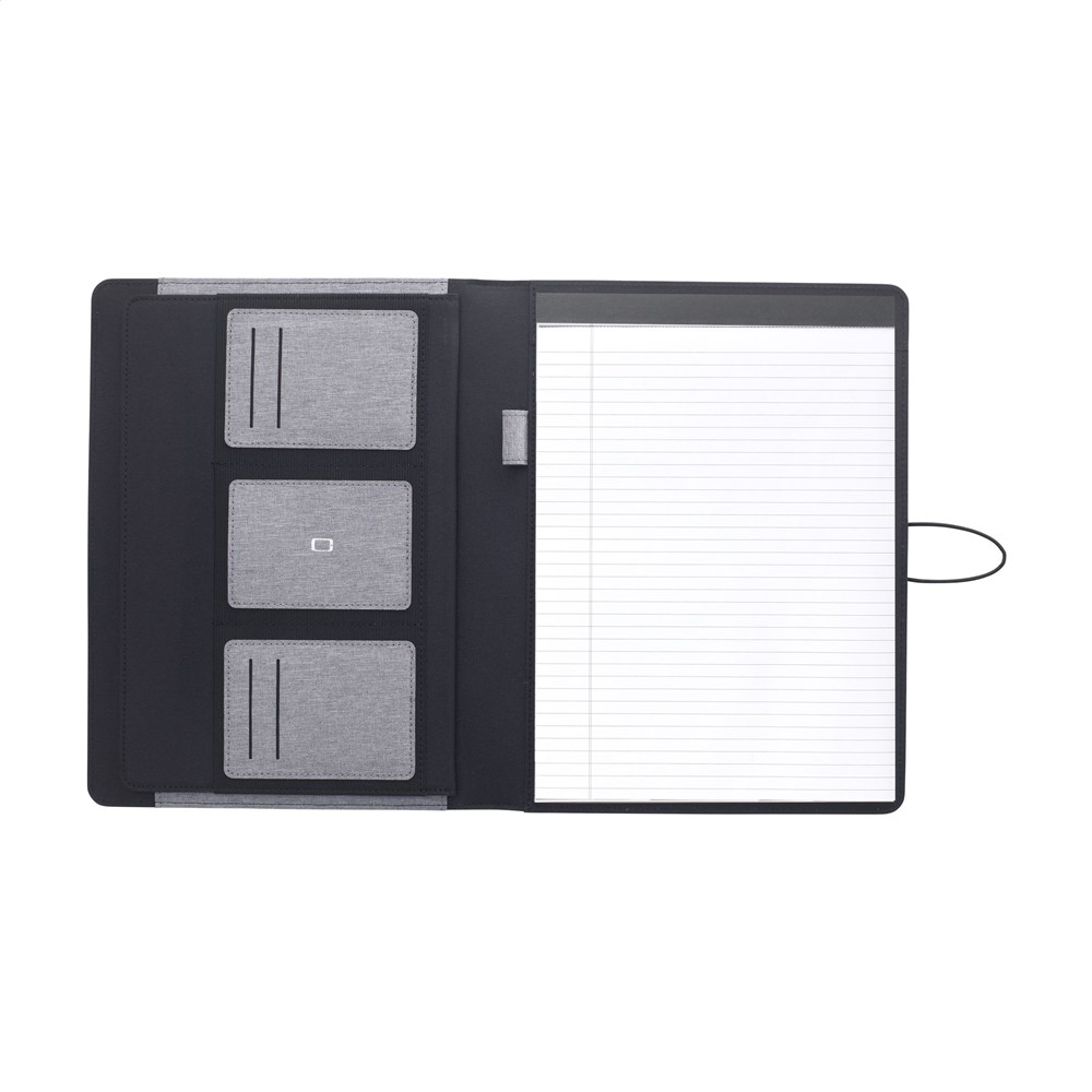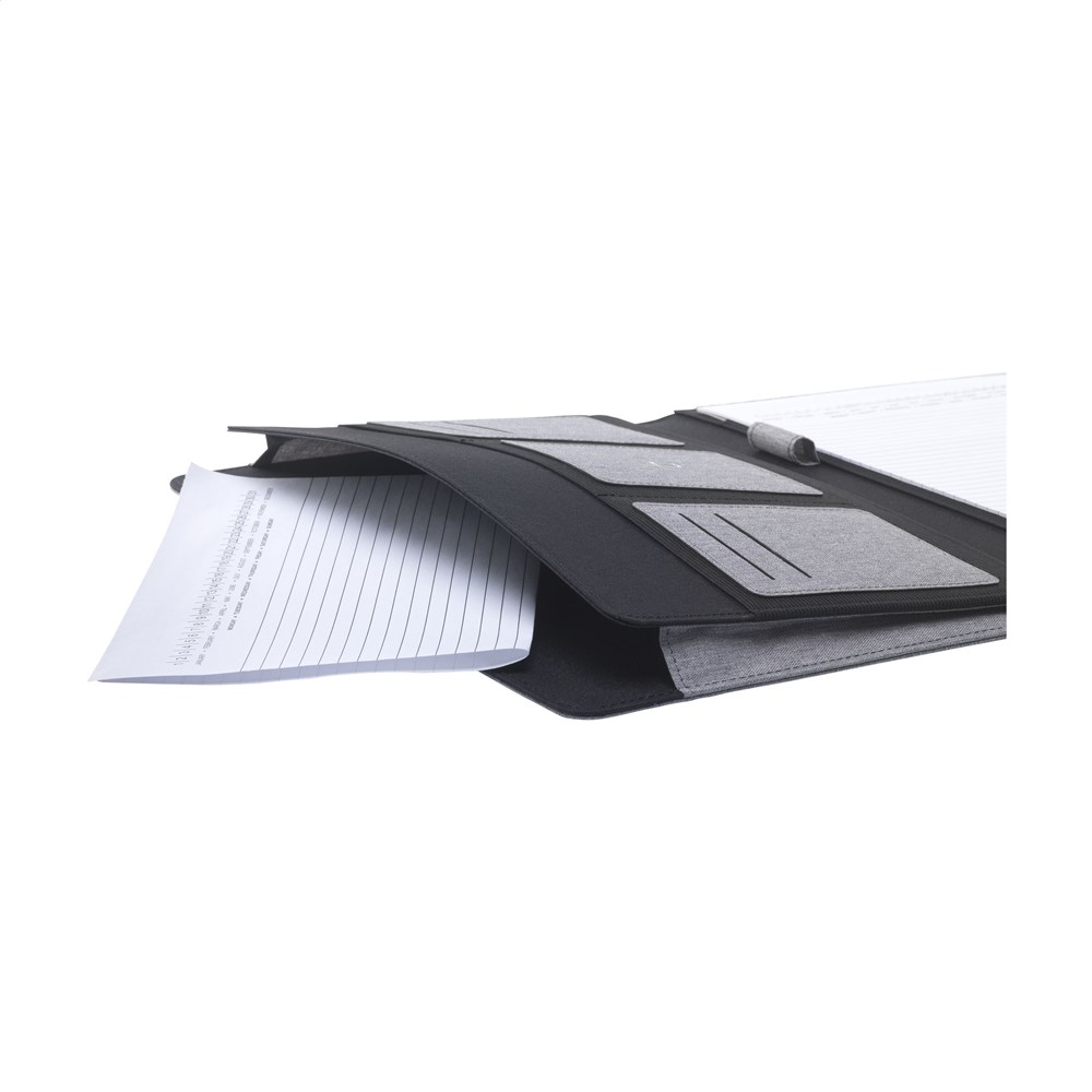 Modern A4 conference/document made from RPET material. Supplied with a number of handy pockets as well as a separate compartment for storing a mobile phone. A pen loop is also included. The folder includes a writing pad with 20 sheets of FSC certified, white lined paper (70 g/m²). RCS-certified. Total recycled material: 6%.