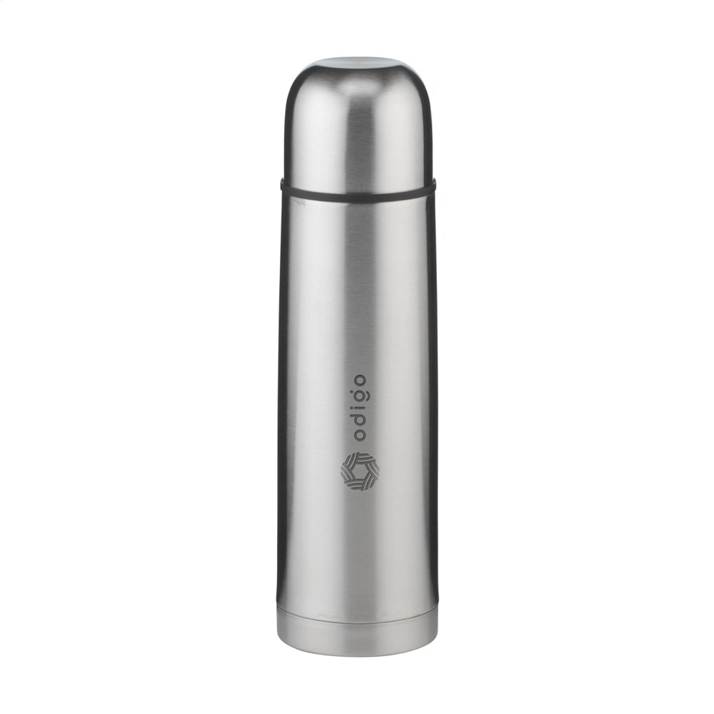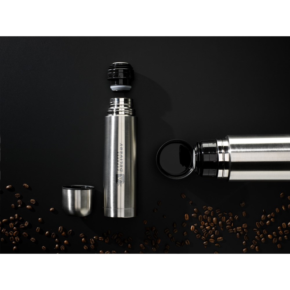 Double-walled, vacuum-insulated thermo bottle made from recycled stainless steel. Extremely durable and unbreakable. The vacuum between the walls insulates the contents and keeps drinks hot or cold for a longer period of time. With screw cap/drinking cup and handy push-pour system. Leak proof. Not dishwasher-safe. RCS-certified. Total recycled material: 69%. Capacity 500 ml. Stainless steel can be recycled many times whilst retaining the quality of the material. By using recycled stainless steel, fewer new raw materials are needed. This means less energy consumption and less use of water. Packed individually.