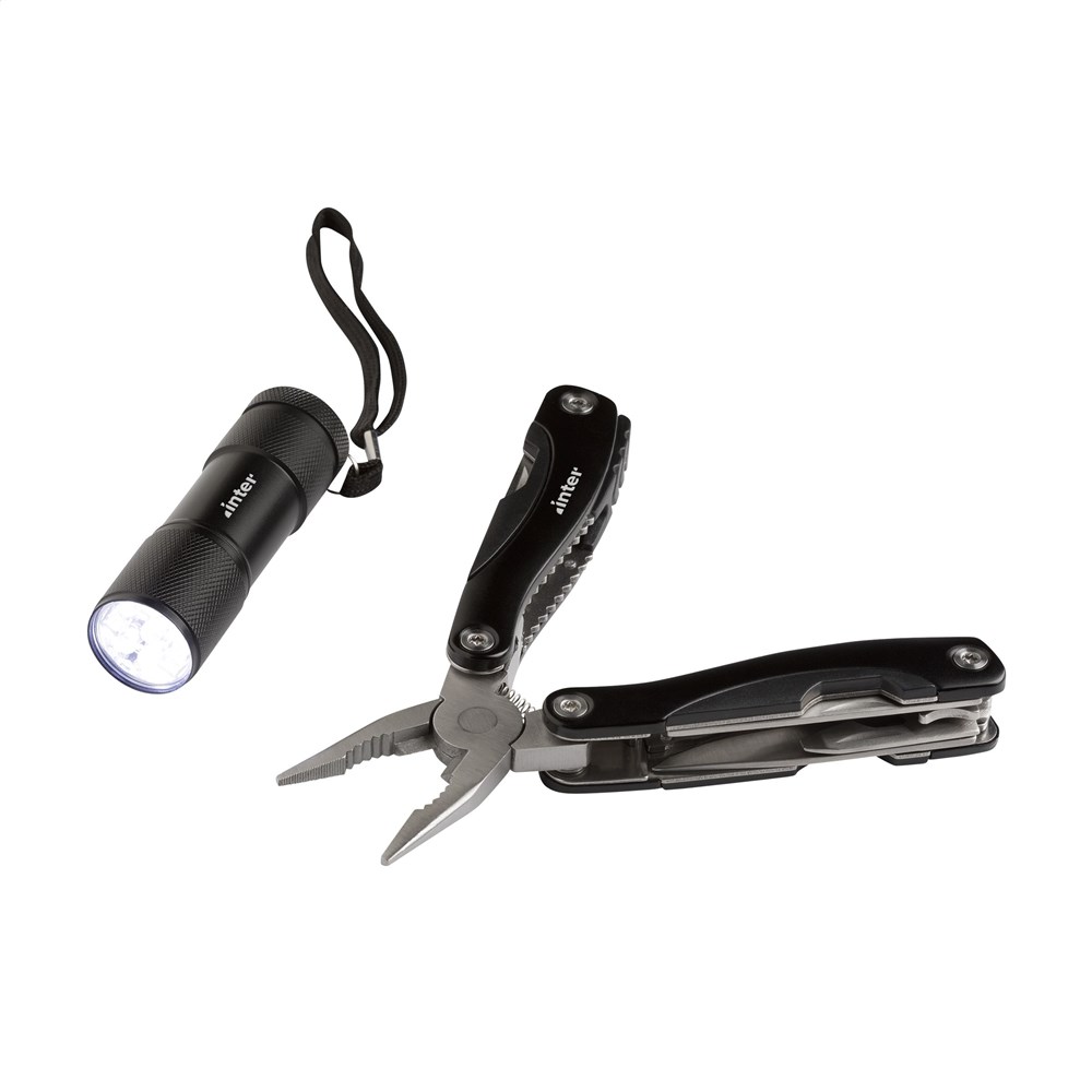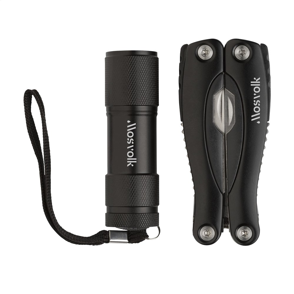 Functional and complete gift set: 9-piece stainless steel multi tool with 12 functions (tongs, wire stripper, saw, 2 screwdrivers, can opener, cap lifter, file, knife, phillips screwdriver, fish scraper, hook removal tool) and aluminium handle and metallic look. Aluminium flashlight (Ø 2.7 x 9 cm) with 9 bright white energy-efficient LED lights and detachable loop. batteries incl. Please note local rules may apply regarding the possession and/or carrying of knives or multitools in public. Items supplied as a set with, each set individually boxed.