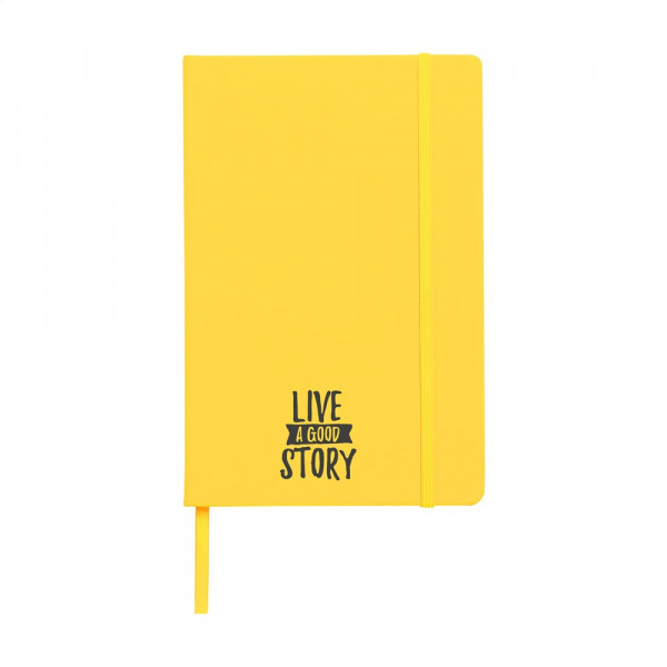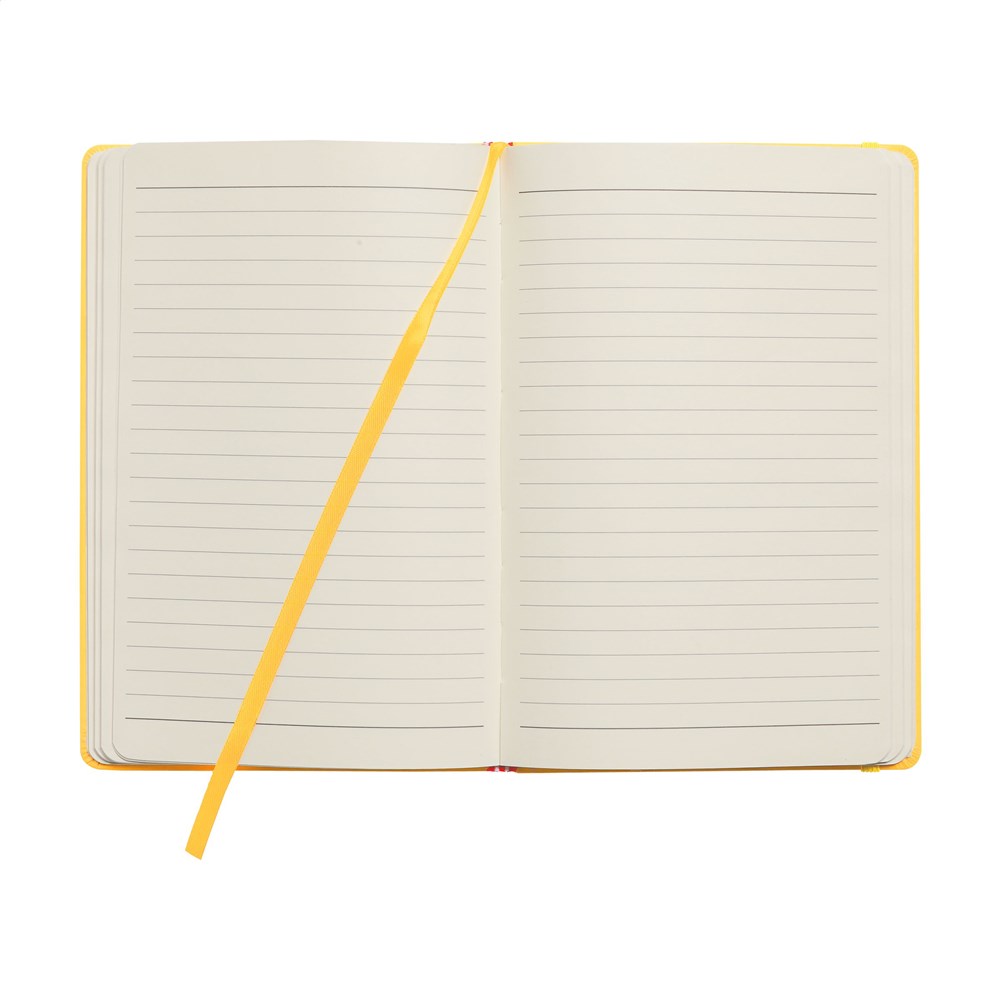 Notebook in A5 format with approx. 96 sheets/192 pages pages of cream coloured, lined FSC Mix certified paper (80 g/m²). With a bound spine, hard cover, elastic fastener and silk ribbon.