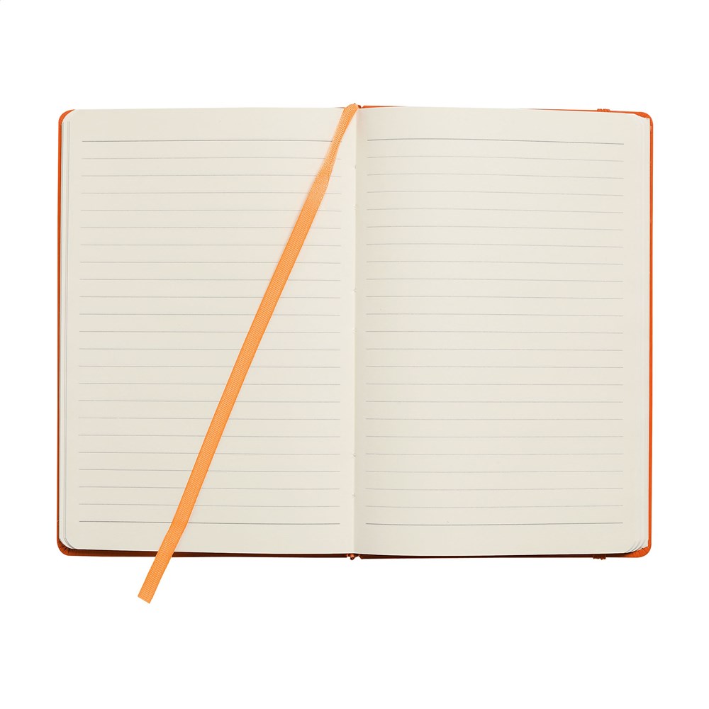 Notebook in A5 format with approx. 96 sheets/192 pages pages of cream coloured, lined FSC Mix certified paper (80 g/m²). With a bound spine, hard cover, elastic fastener and silk ribbon.