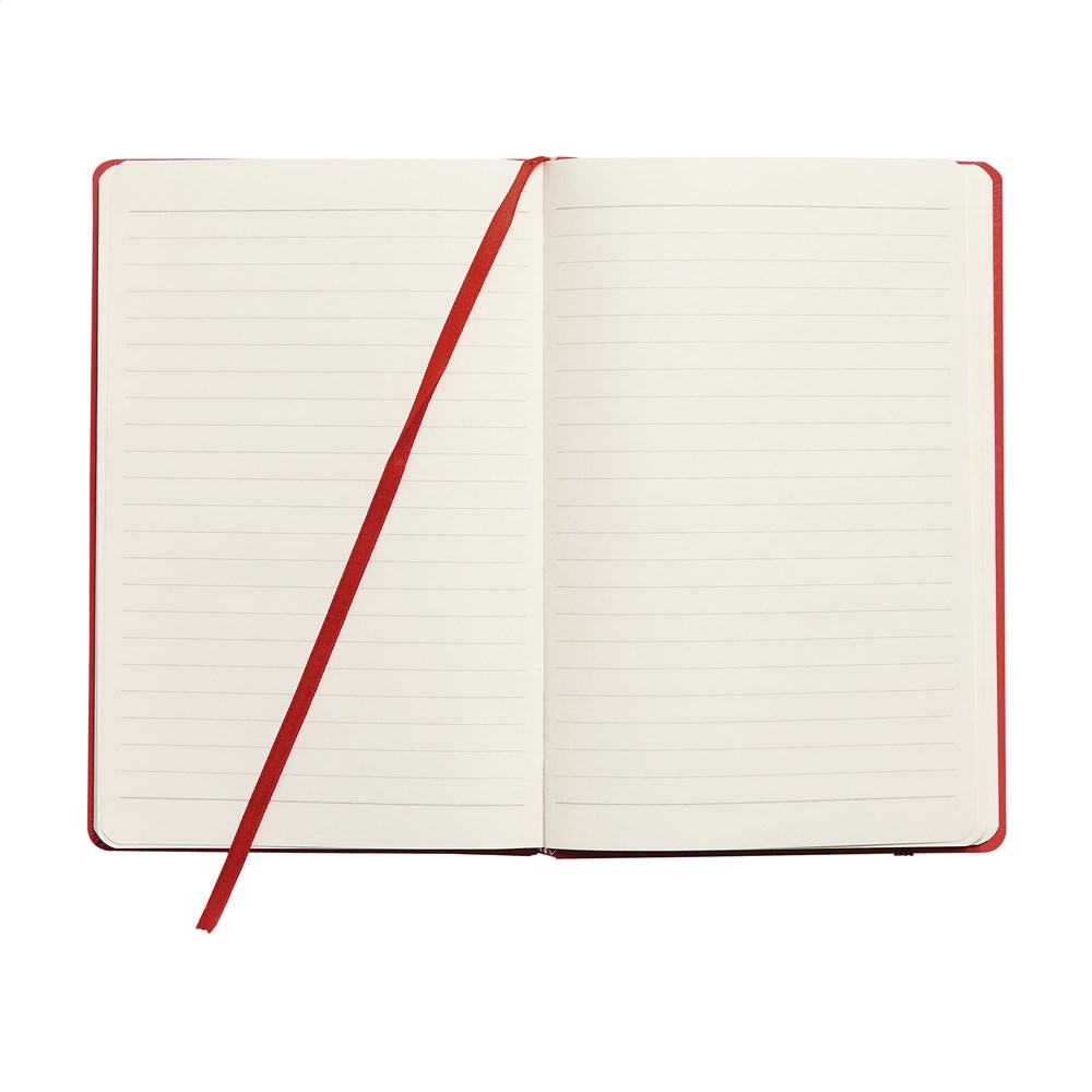 Notebook in A5 format with approx. 96 sheets/192 pages pages of cream coloured, lined FSC Mix certified paper (80 g/m²). With a bound spine, hard cover, elastic fastener and silk ribbon.