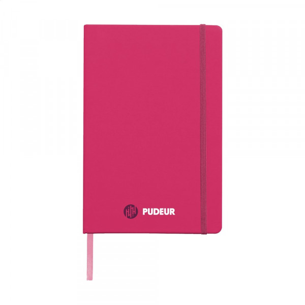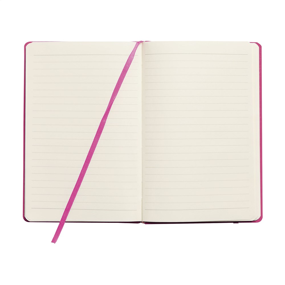 Notebook in A5 format with approx. 96 sheets/192 pages pages of cream coloured, lined FSC Mix certified paper (80 g/m²). With a bound spine, hard cover, elastic fastener and silk ribbon.