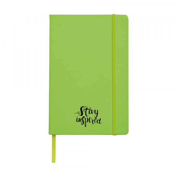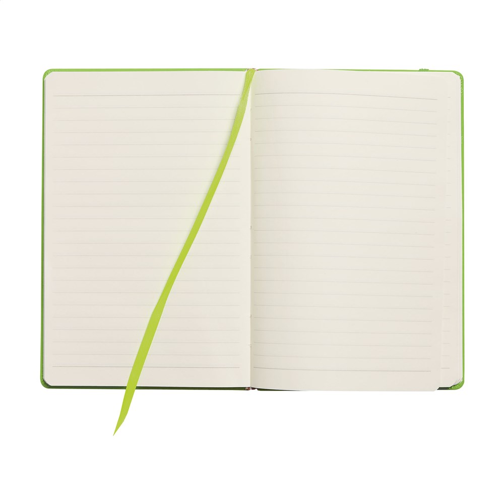 Notebook in A5 format with approx. 96 sheets/192 pages pages of cream coloured, lined FSC Mix certified paper (80 g/m²). With a bound spine, hard cover, elastic fastener and silk ribbon.