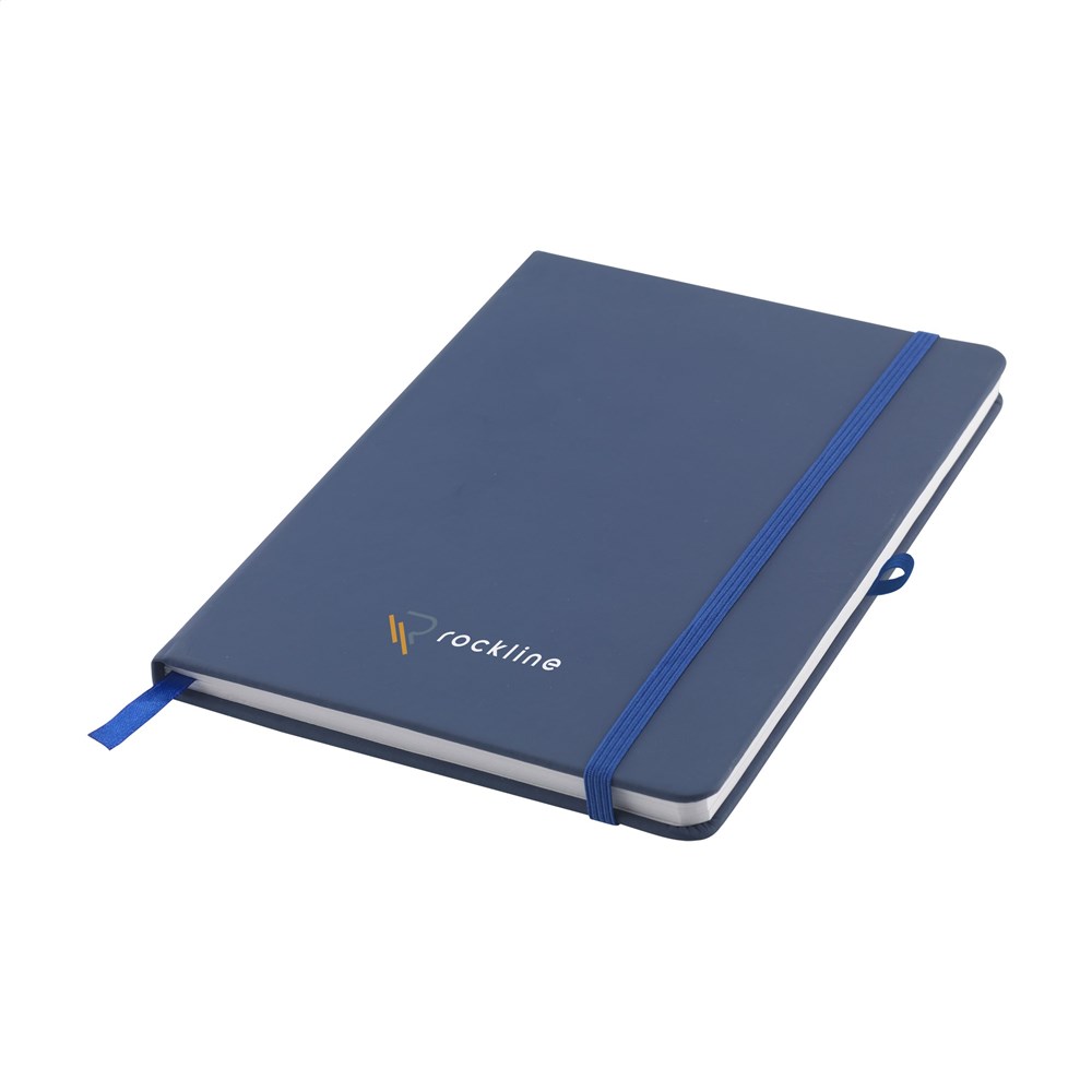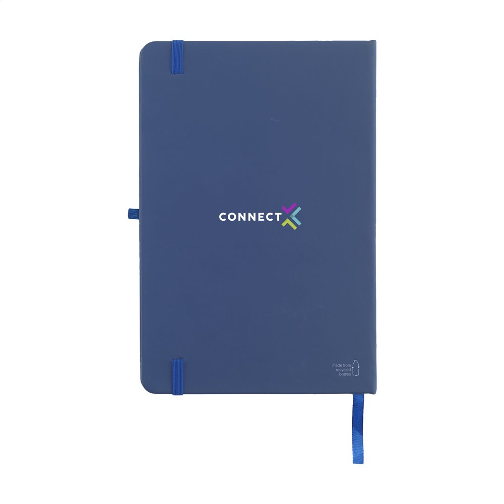 Practical notebook in A5 format. With hard RPET cover (made from PET bottles) and approx. 80 sheets/160 sheets of cream coloured, lined paper (70 g/m²). With handy elastic closure, reading ribbon and pen loop.