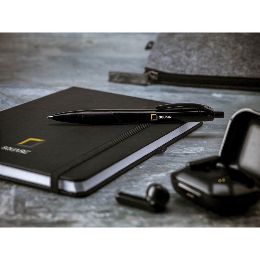 Practical notebook in A5 format. With hard RPET cover (made from PET bottles) and approx. 80 sheets/160 sheets of cream coloured, lined paper (70 g/m²). With handy elastic closure, reading ribbon and pen loop.