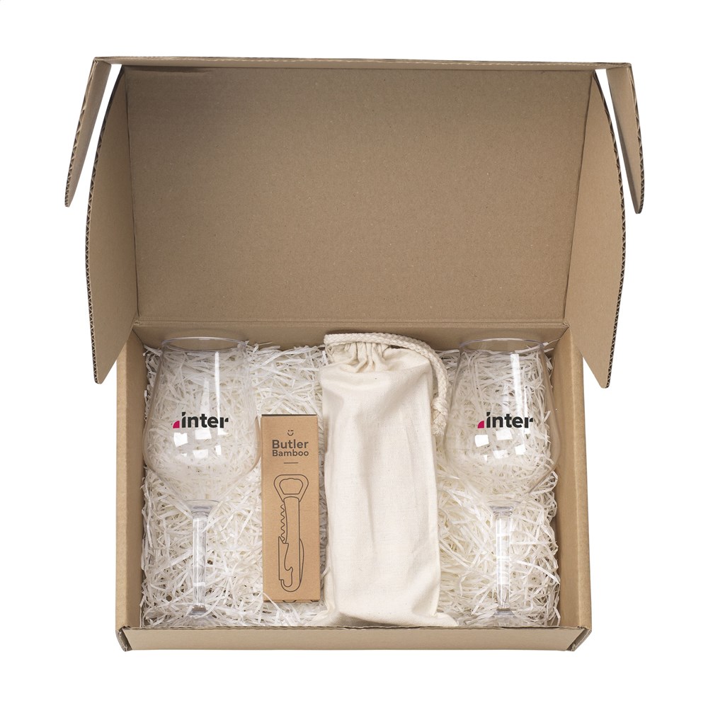 A gift set perfect for a number of different occasions. Whatever the celebration: welcoming a new colleague, giving an end-of-year gift, showing your appreciation to employees, or simply strengthening your business relationships, you will leave a lasting impression with this gift set. In this set you will find the following items: • 1200 Butler Bamboo • 2 x 4509 HappyGlass Lady Abigail wine glass • 1205 Tower Game. Make this set even more special by printing a name, quote or logo on each individual product. These products are delivered as a set in a kraft gift box.