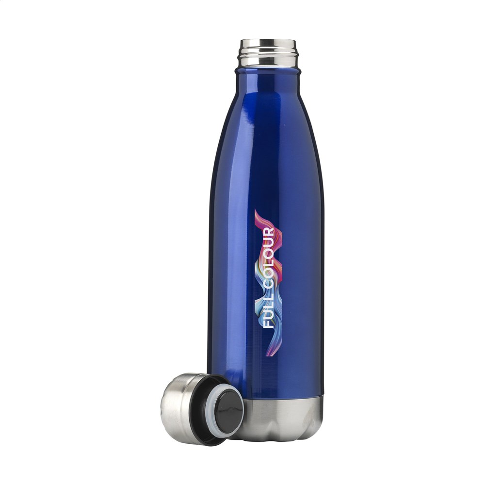 Double walled, vacuum-insulated, stainless steel water bottle/thermo bottle. With leak proof screw cap. Made in metallic or with beautiful top layer in matt finish (only the black one and the white one). Suitable for maintaining the temperature of cold or hot water. Not dishwasher-safe. Capacity 500 ml. Packed individually.
