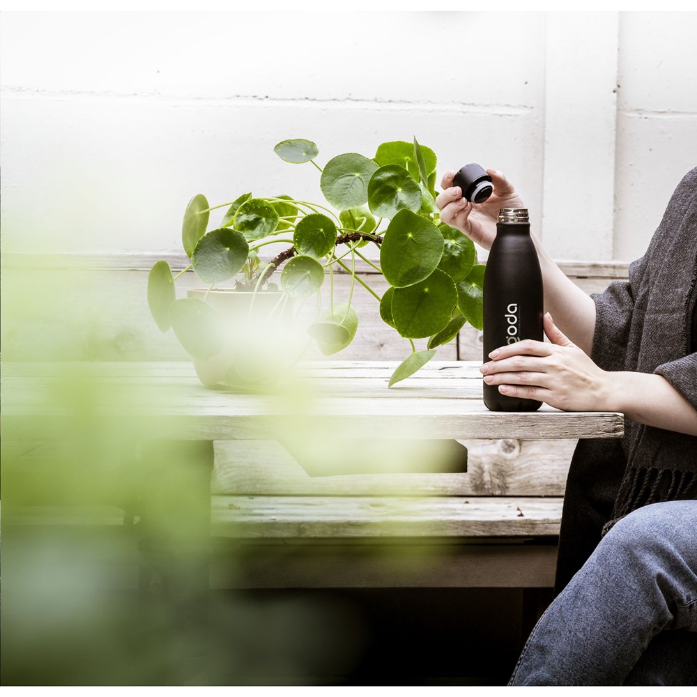 Double-walled, leak proof water/thermos bottle made from recycled stainless steel. Supplied in a modern matte finish with matching screw cap, this bottle has a striking appearance. This slim bottle will fit cup holders in a wide range of cars and is the perfect thirst quencher whilst on the go. Not dishwasher-safe. RCS-certified. Total recycled material: 85%. Capacity 500 ml. Stainless steel can be recycled many times whilst retaining the quality of the material. By using recycled stainless steel, fewer new raw materials are needed. This means less energy consumption and less use of water. Packed individually.