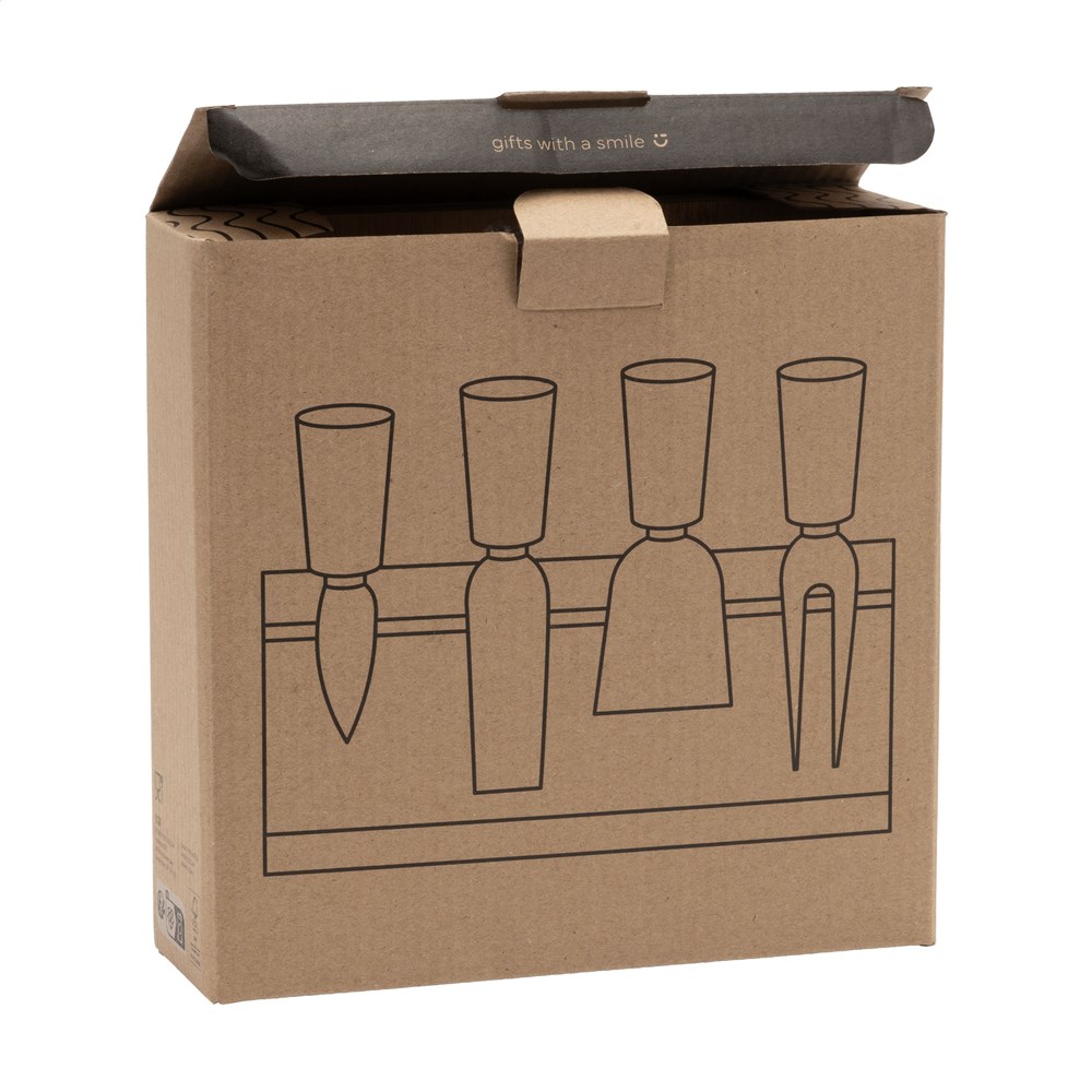 Cheese board made from FSC 100% certified bamboo. With knife holder equipped with a magnetic strip. Incl. 3 cheese knives and 1 cheese stick. NOTE: Due to the natural grains and contours of bamboo, we cannot guarantee consistency in depth/colour of the engraving. Packed per set.
