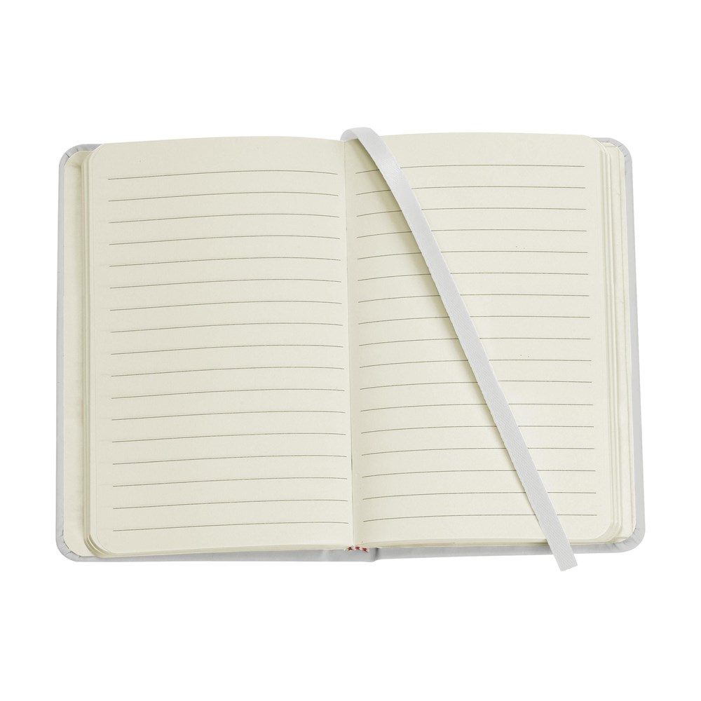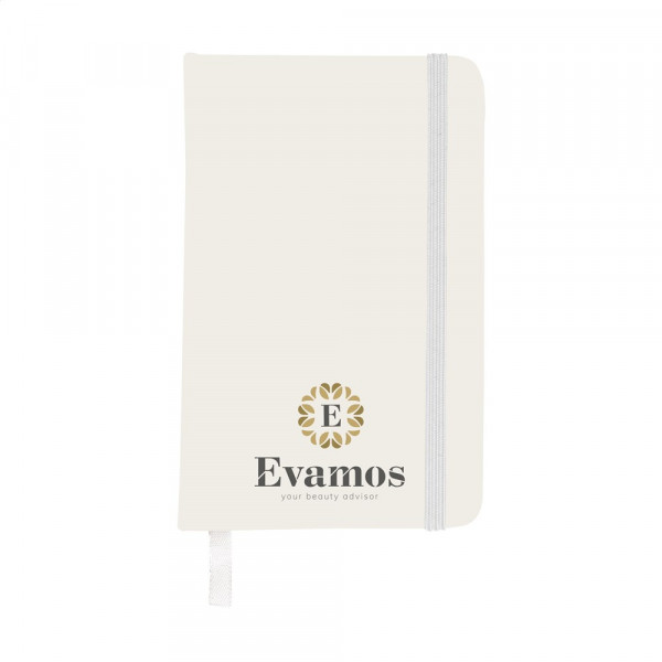 Compact notebook in A6 format with approx. 96 sheets/192 pages of cream coloured, lined FSC Mix certified paper (80 g/m²). With a perfect binding, hard cover, pocket, elastic fastener and silk ribbon.