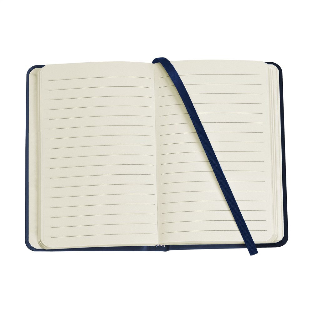 Compact notebook in A6 format with approx. 96 sheets/192 pages of cream coloured, lined FSC Mix certified paper (80 g/m²). With a perfect binding, hard cover, pocket, elastic fastener and silk ribbon.