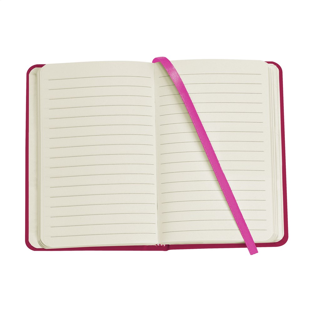 Compact notebook in A6 format with approx. 96 sheets/192 pages of cream coloured, lined FSC Mix certified paper (80 g/m²). With a perfect binding, hard cover, pocket, elastic fastener and silk ribbon.