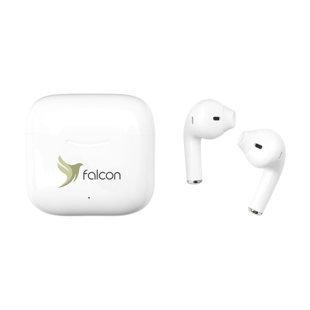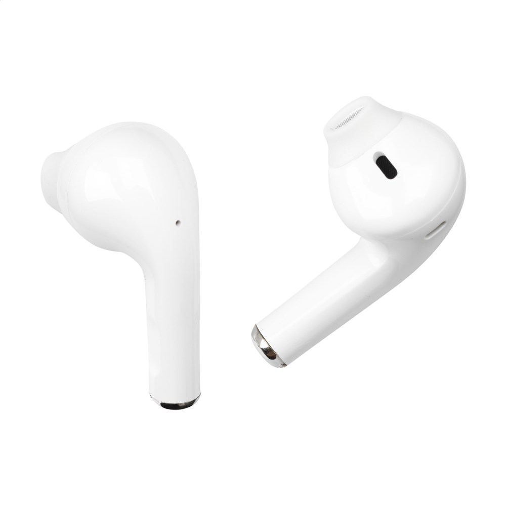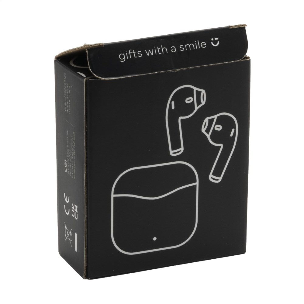 Next generation true wireless earphones in charging case made from recyced ABS. These earphones use BT 5.1 for a smooth connection. The earphones have a 30 mAh battery and take only one hour to charge with the 200 mAh charging case. Play time on medium volume: 2-3 hours. Excellent sound reproduction and adjustable volume is coupled with autopairing technology providing automatic pairing and touch control. Easily make hands-free phone calls and enjoy music without restrictive cables. Connection has a 10-meter range. Includes a PVC-free charging cable Type-C and user manual. RCS-certified. Total recycled material: 62.5%. Packed individually.