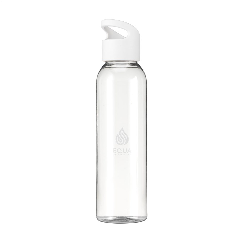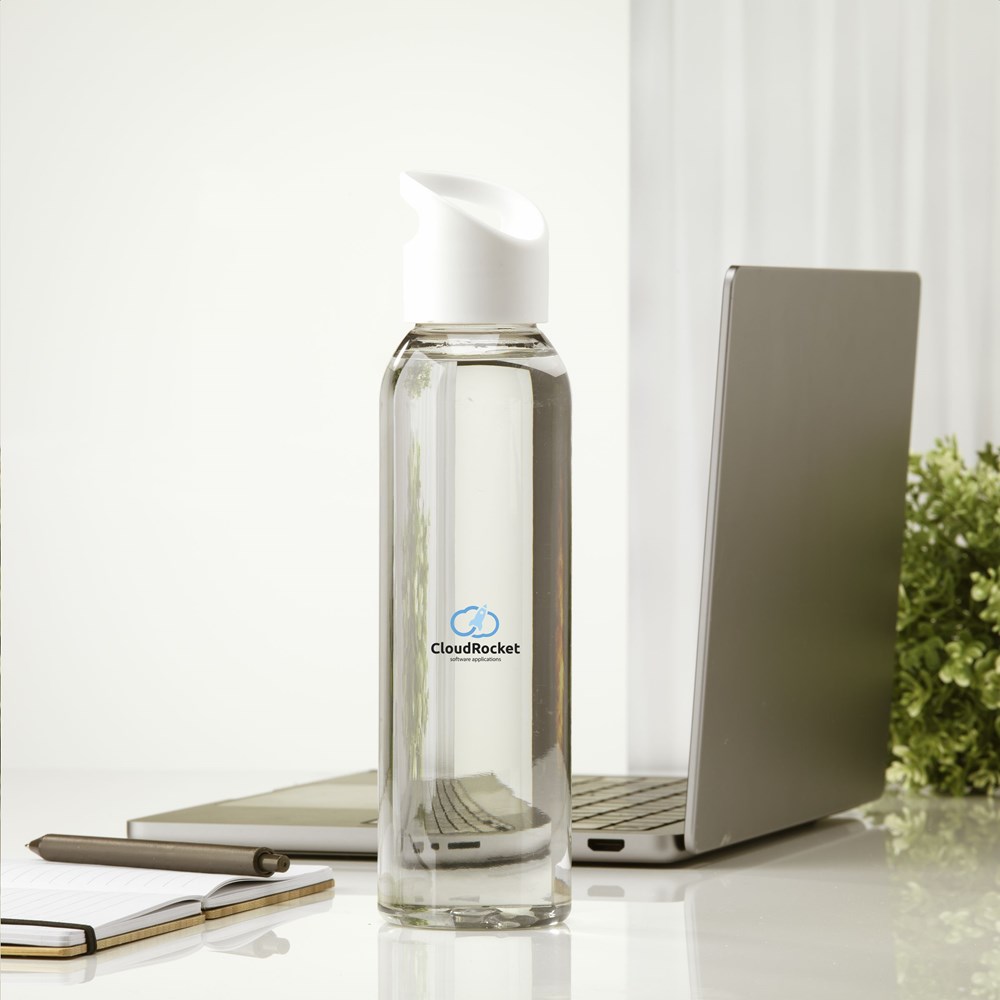 Luxury water bottle made from clear RPET. With a practical, plastic screw cap. Leak proof and re-usable. Not dishwasher safe. Capacity 650 ml. GRS-certified. Total recycled material: 82%.